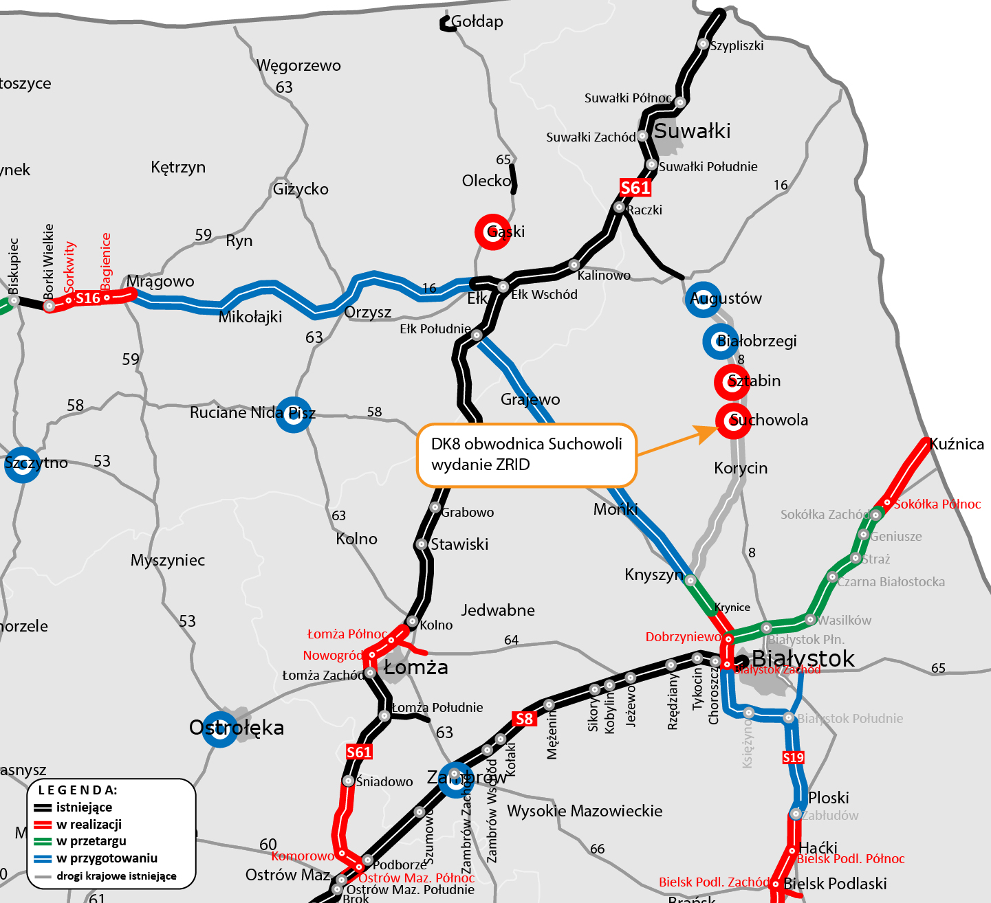 W ramach umowy zawartej z firmą Budimex w maju 2021 r. powstanie jednojezdniowa obwodnica o długości 15,1 km. Poprowadzona będzie po wschodniej stronie miejscowości. Realizacja obwodnicy Suchowoli rozpocznie się od rozpoznania saperskiego, wycinki drzew i przygotowania dróg technologicznych. W kolejnym etapie ruszą roboty ziemne. Planowane zakończenie prac przy budowie obwodnicy przypada na połowę 2025 r.