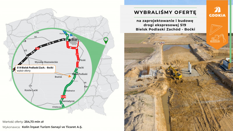 Wybraliśmy najkorzystniejszą ofertę w przetargu na zaprojektowanie i budowę drogi ekspresowej S19 na odcinku Bielsk Podlaski Zachód - Boćki. Ponownie jest to oferta firmy Kolin İnşaat Turizm Sanayi ve Ticaret, opiewająca na kwotę 254,73 mln zł.