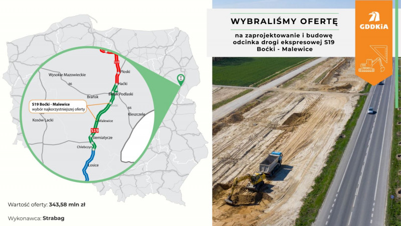 Oferta firmy Strabag została uznana za najkorzystniejszą w przetargu na wykonanie odcinka drogi ekspresowej S19 o długości 16 km, od węzła Boćki do rejonu miejscowości Malewice.