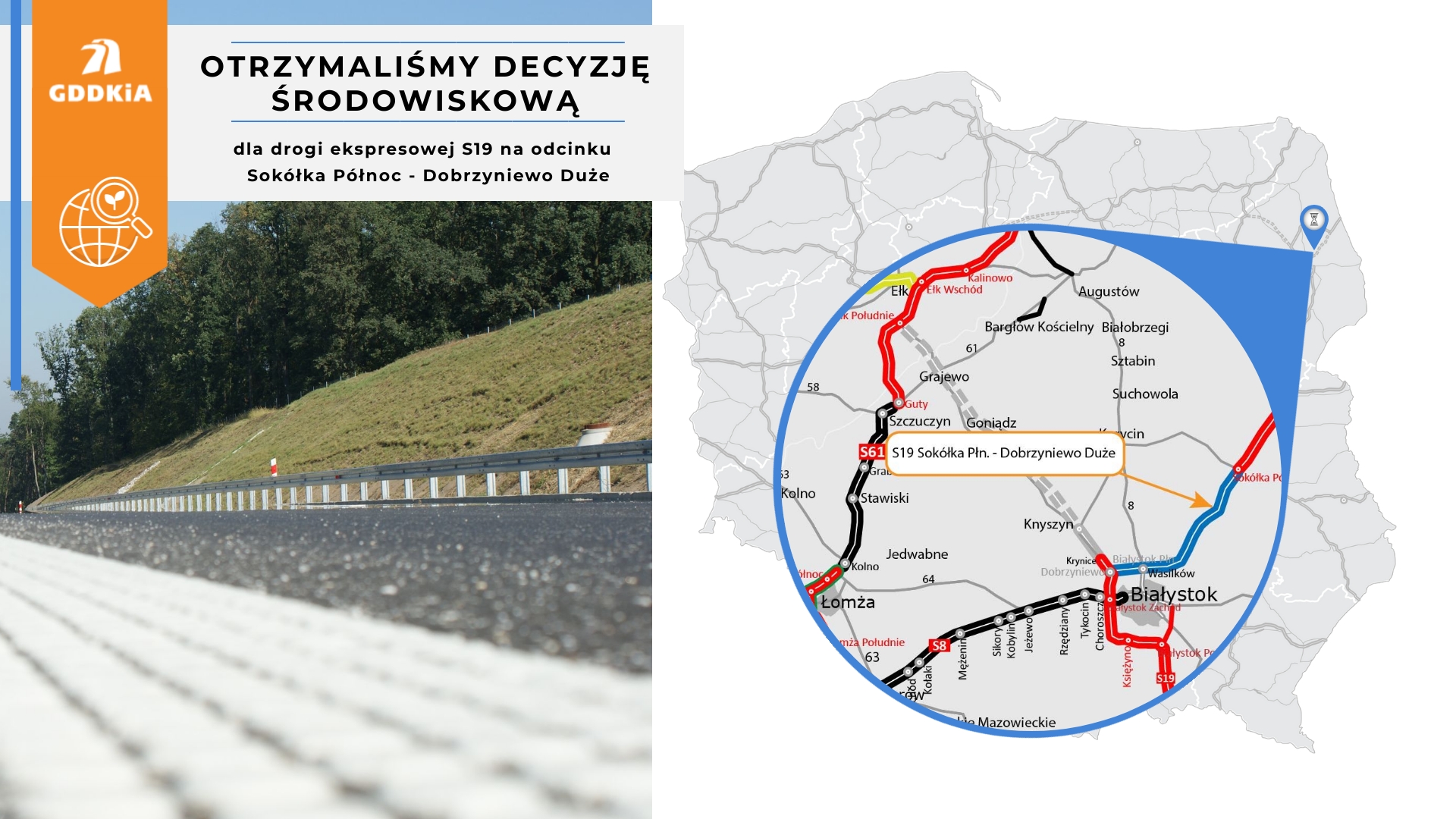 Decyzją z 28 września RDOŚ zatwierdził przebieg drogi S19 na odcinku Sokółka – Dobrzyniewo Duże w wariancie piątym, preferowanym przez GDDKiA. Przedsięwzięcie to będzie polegać na budowie dwujezdniowej drogi ekspresowej S19 o długości około 44 km.
