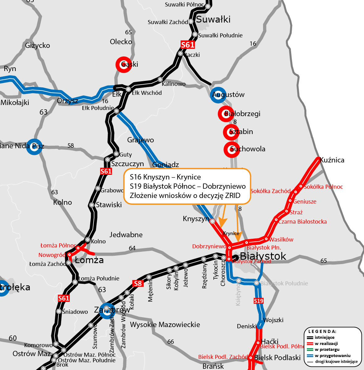 Złożyliśmy do Wojewody Podlaskiego wnioski o wydanie decyzji o zezwoleniu na realizację inwestycji drogowej (ZRID) dla dwóch odcinków dróg ekspresowych: S16 Knyszyn – Krynice i S19 Białystok Północ – Dobrzyniewo. Umowy na projekt i budowę obu „esek” podpisaliśmy 14 maja 2024 r. Planujemy, że będą one gotowe w połowie 2028 r.