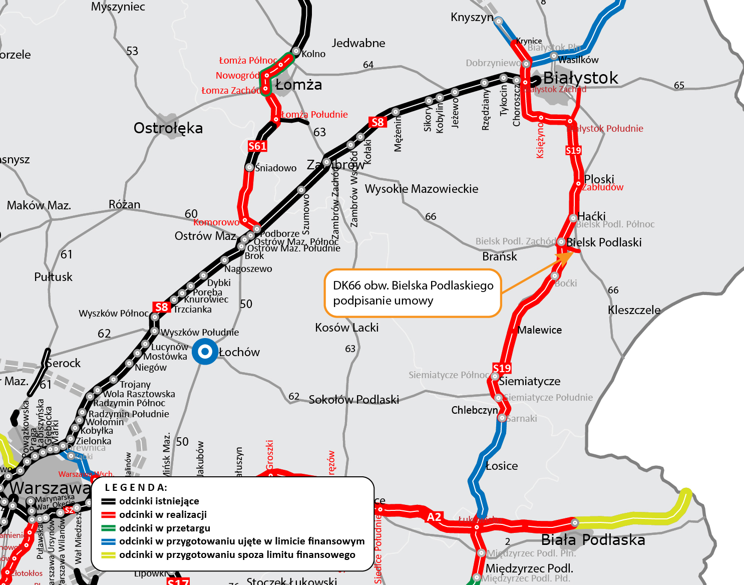 Podpisaliśmy umowę na zaprojektowanie i budowę 3-kilometrowego fragmentu południowej obwodnicy Bielska Podlaskiego w ciągu drogi krajowej nr 66. Wykonawcą prac będzie konsorcjum trzech firm - Unibep, Budrex i Value Engineering, które zrealizuje zadanie za 77,73 mln zł.