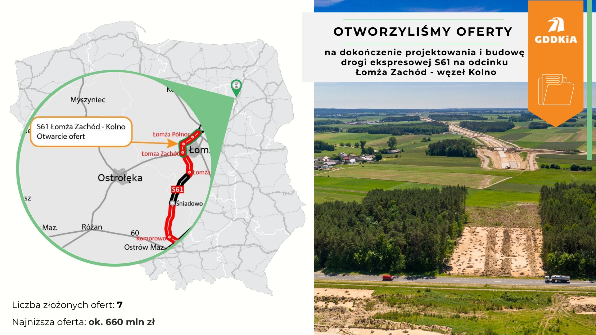 Najniższą cenę za wybudowanie prawie 13-kilometrowego odcinka S61 zaproponowało konsorcjum NDI (lider), NDI SOPOT i B4 (partnerzy) - 660,01 mln zł. Najdroższą ofertę przedstawiło konsorcjum firm PORR (lider), UNIBEP oraz BUDREX (partnerzy) - 795,19 mln zł. Wszystkie złożone oferty mieszczą się w naszych szacunkach (971,3 mln zł). Komisja przetargowa rozpocznie teraz procedurę badania i oceny ofert w celu wyłonienia tej najkorzystniejszej.