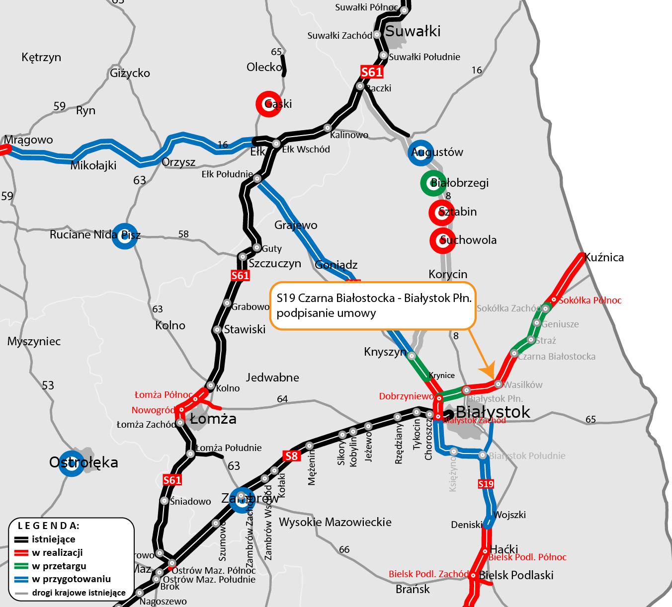 Oprócz odcinka, na który właśnie podpisaliśmy umowę, mamy wyłonionych wykonawców dwóch pozostałych odcinków S19 na północ od Białegostoku. S19 Sokółka – Czarna Białostocka o długości 24,1 km (firma Stecol z ofertą 828,8 mln zł.) oraz Białystok Północ – Dobrzyniewo o długości 9,47 km (firma Unibep z ofertą 320,88 mln zł.) Oba rozstrzygnięcia, wskutek odwołań od wyroków Krajowej Izby Odwoławczej potwierdzających wybór GDDKiA, trafiły do sądu.