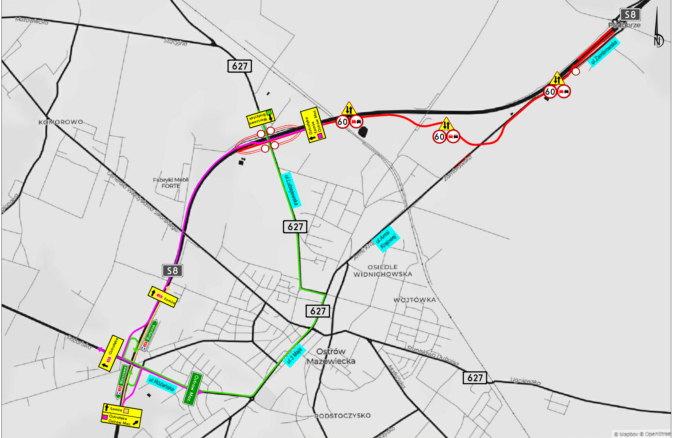 S8 na zamykanym właśnie dotychczasowym węźle Ostrów Mazowiecka Północ z jego nowopowstającą lokalizacją. Takie rozwiązanie umożliwi wjazd z drogi wojewódzkiej nr 627 na drogi S8 i S61 właśnie na nowym węźle Ostrów Mazowiecka Północ. W budowie jest także ponad 3,5 km drogi wojewódzkiej nr 627 od drogi wojewódzkiej w rejonie miejscowości Stok do węzła Komorowo na drodze S61.