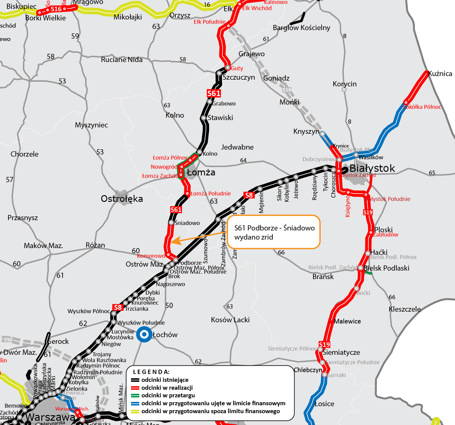 Wojewoda Mazowiecki wydał decyzję o zezwoleniu na realizację inwestycji drogowej (ZRID) dla odcinka S61 Podborze - Śniadowo. To ostatni fragment międzynarodowego korytarza transportowego Via Baltica, który tej decyzji nie miał. W najbliższych dniach nastąpi przekazanie placu budowy wykonawcy. Droga ma być oddana do ruchu pod koniec 2023 roku.