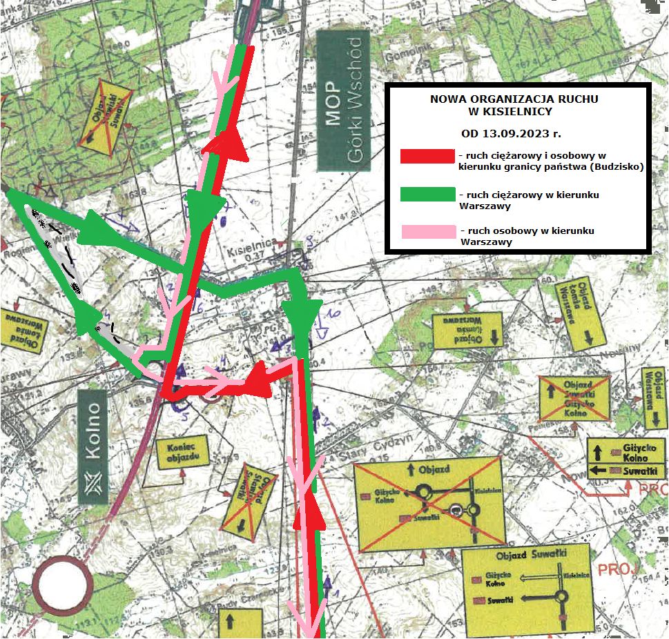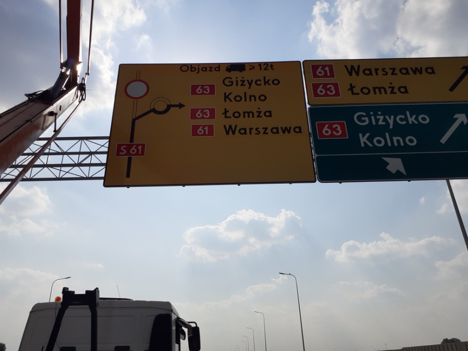 Zmieniliśmy organizację ruchu na północ od Łomży - w pobliżu węzła Kolno na S61 oraz miejscowości Kisielnica po DK61 i 63. Zmiana ma upłynnić ruch pojazdów ciężkich w tym rejonie. Będzie obowiązywać do chwili uzyskania przejezdności budowanej obecnie obwodnicy Łomży, czyli do połowy przyszłego roku.