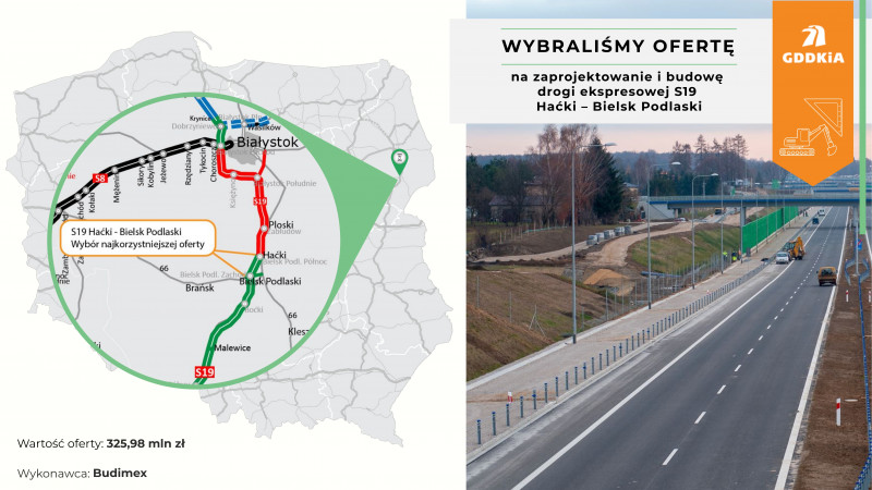 W ubiegłym roku ogłosiliśmy przetargi na 10 odcinków drogi ekspresowej S19 na terenie województwa podlaskiego. Pięć umów już podpisaliśmy i jesteśmy krok przed podpisaniem kolejnej, na 9-kilometrowy odcinek Haćki - Bielsk. Właśnie wskazaliśmy, że najkorzystniejszą ofertę złożyła firma Budimex.