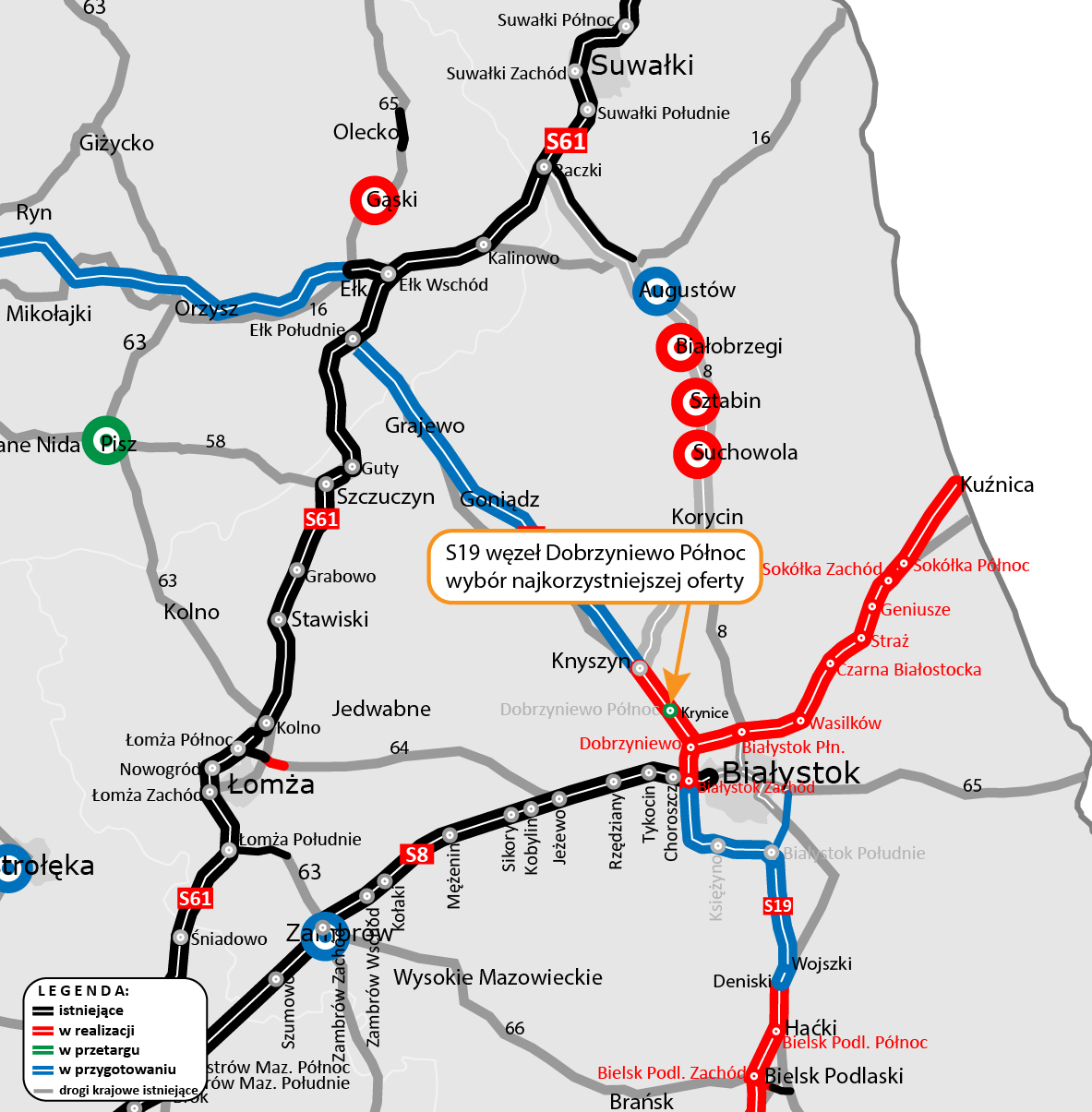 Wybraliśmy najkorzystniejszą ofertę w przetargu na projekt i budowę dodatkowego węzła na realizowanym obecnie odcinku S19 Krynice - Dobrzyniewo - Białystok Zachód. Węzeł Dobrzyniewo Północ powstanie jako odrębne zadanie.