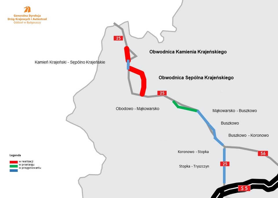 Przygotowujemy dalszą rozbudowę DK25, która usprawni ruch z Mąkowarska do Tryszczyna. Zadanie podzielone jest na pięć odcinków. Droga będzie miała docelowo parametry tożsame z wyżej omawianymi odcinkami, a więc przystosowanie konstrukcji drogi do przenoszenia obciążeń 11,5 t./oś, nowa ścieżka dla pieszych i rowerzystów oraz przebudowa skrzyżowań. 10 stycznia br. złożyliśmy wniosek o wydanie decyzji środowiskowej (DŚU) dla omawianego odcinka. Jego rozpatrzeniem zajmuje się Burmistrz Koronowa. W przyszłym roku - po uzyskaniu DŚU i pozwolenia na budowę planujemy ogłoszenie przetargu.