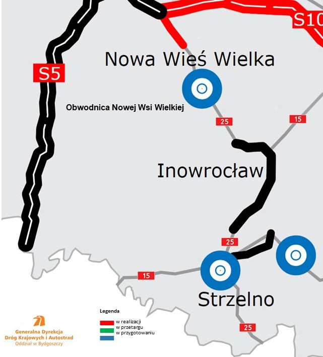 Inwestycja obejmuje odcinek dróg krajowych nr 15 i 25 w Strzelnie. Jej celem jest wyprowadzenie tranzytowego z centrum Strzelna, podniesienie bezpieczeństwa ruchu drogowego, pieszych oraz polepszenie warunków techniczno-użytkowych drogi. Obecnie oba odcinki dróg krajowych przebiegają przez miasto ulicami jednokierunkowymi m.in. przy Rynku Strzelna. Około 2,5 km odc. obwodnicy będzie stanowił nowy przebieg DK25 na wschód od miasta. Jeszcze w I połowie br. planujemy złożenie wniosku o DŚU.