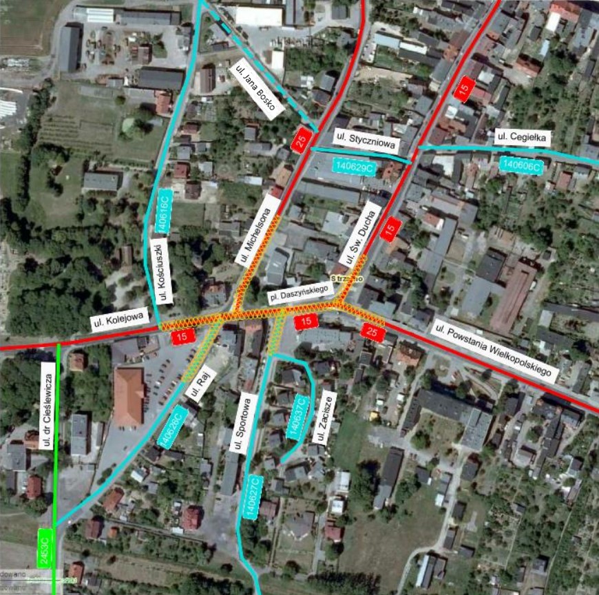 - zamknięcie wlotu ul. Raj od drogi krajowej (objazd ul. Cieslewicza)
