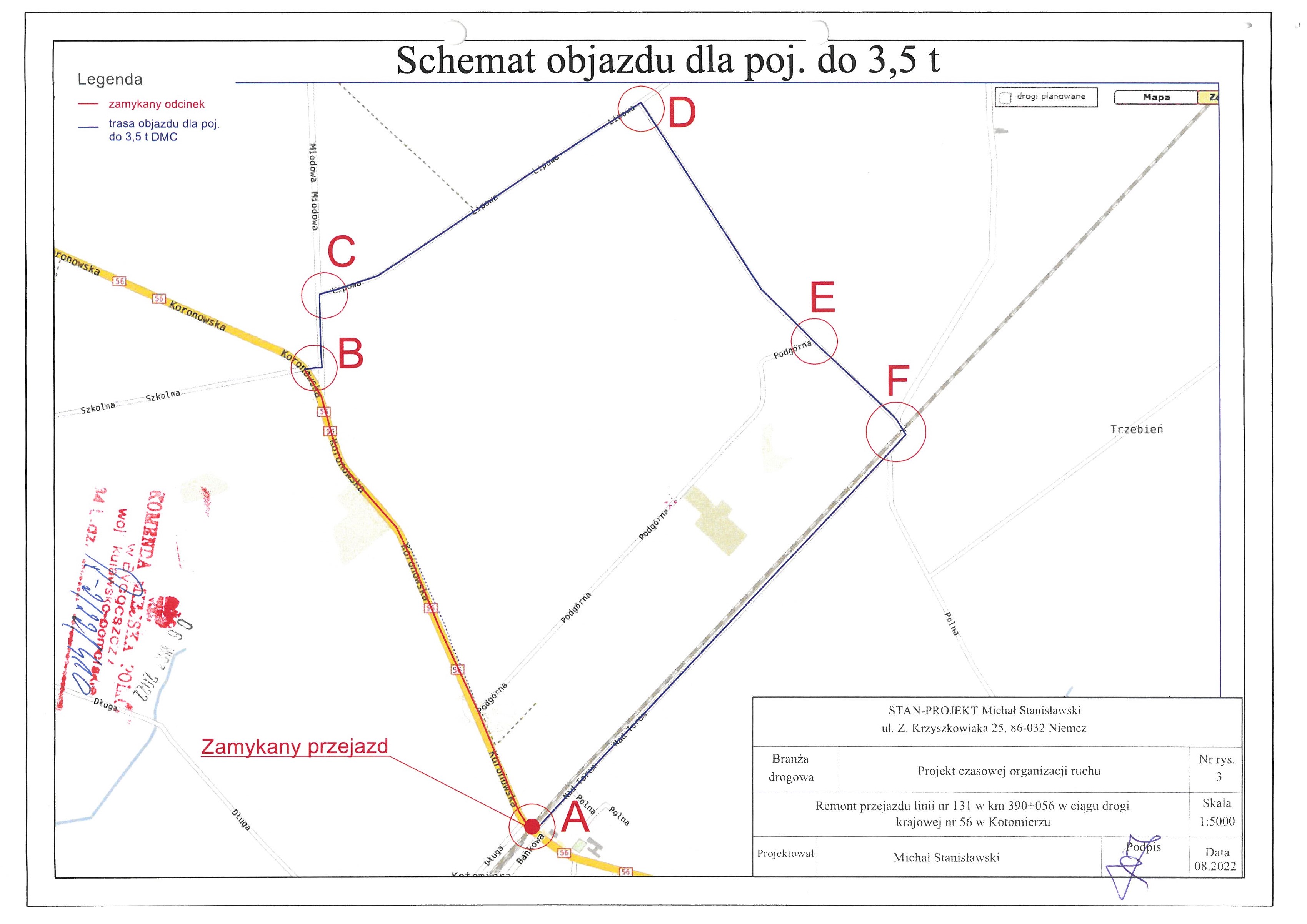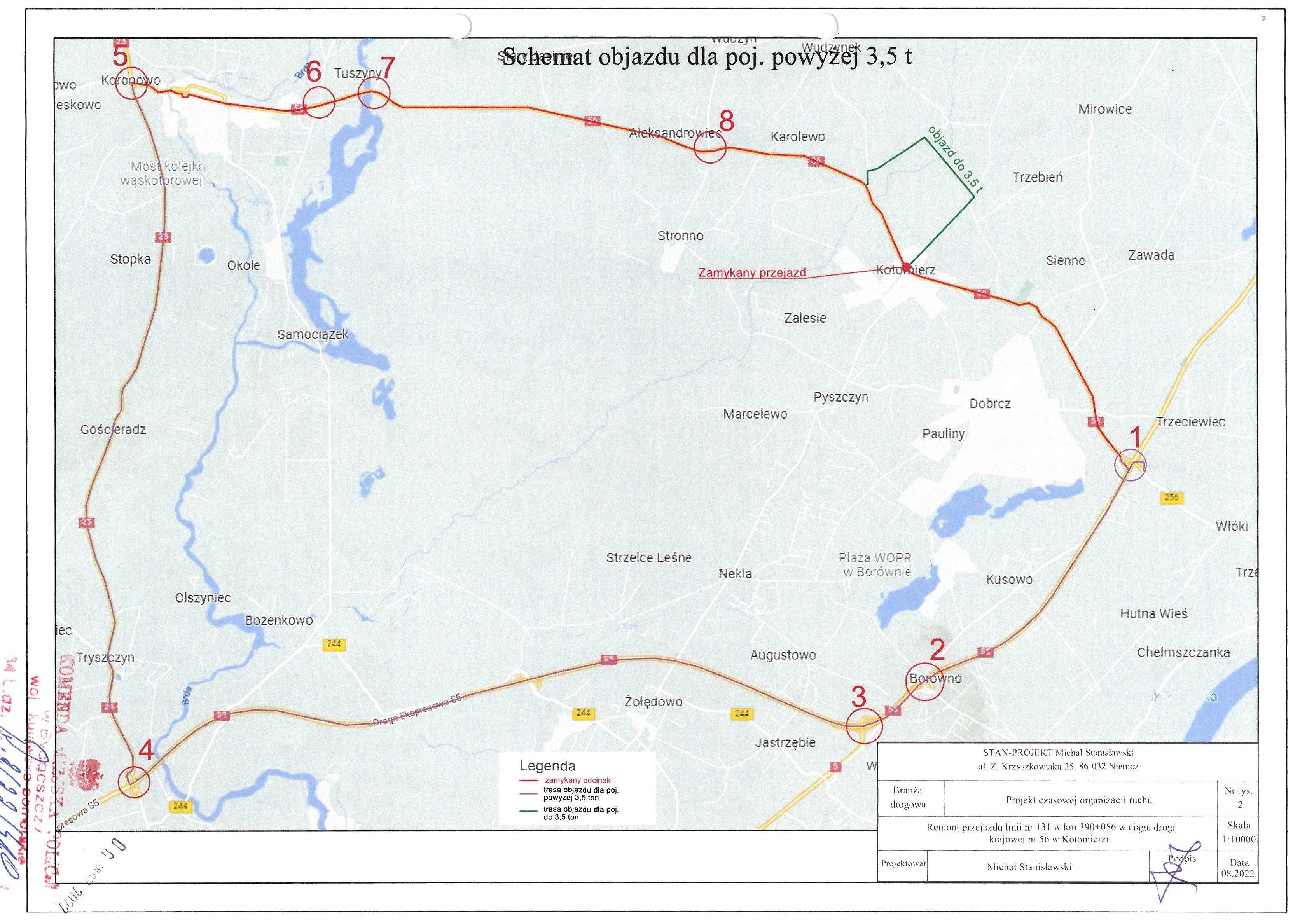 Pomorskie Przedsiębiorstwo Mechaniczno-Torowe poinformowało o konieczności wprowadzenia zmienionej organizacji ruchu w związku z robotami w obrębie przejazdu kolejowego w m. Kotomierz na DK56. Przebudowa wymaga całkowitego zamknięcia przejazdu, dlatego ruch został poprowadzony objazdami. Dla pojazdów do 3,5 ton trasa prowadzi drogami lokalnymi przez ul. Nad Torem, Lipową i Miodową, natomiast dla pojazdów powyżej 3,5 ton drogą S5I do DK25 i DK56.