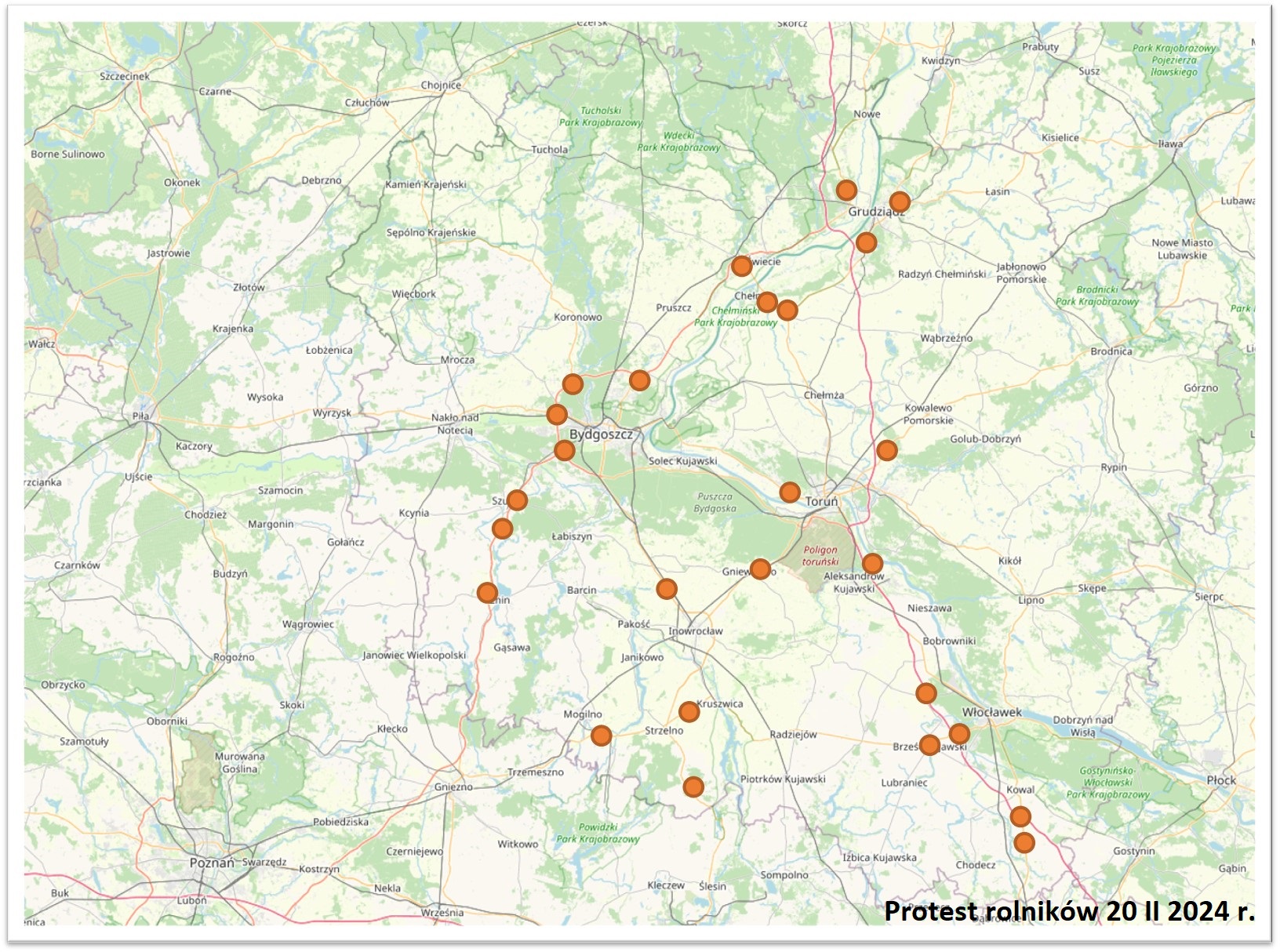 Zgodnie z przesłanymi przez organizatorów zgłoszeniami protesty mają odbyć się w szeregu lokalizacji na drogach krajowych w woj. kujawsko-pomorskim. Rolnicy zapowiadają, że całkowicie zablokują niektóre zjazdy z drogi ekspresowej S5 czy autostrady A1 (w tym na obwodnicy Bydgoszczy). Na bieżąco informacje będą dostępne przez Punkt Informacji Drogowej, serwis drogi.gddkia.gov.pl oraz platformę X (dawny Twitter). Informacje o utrudnieniach będą wyświetlane na tablicach zmiennej treści. GDDKiA nie jest adresatem postulatów protestu.