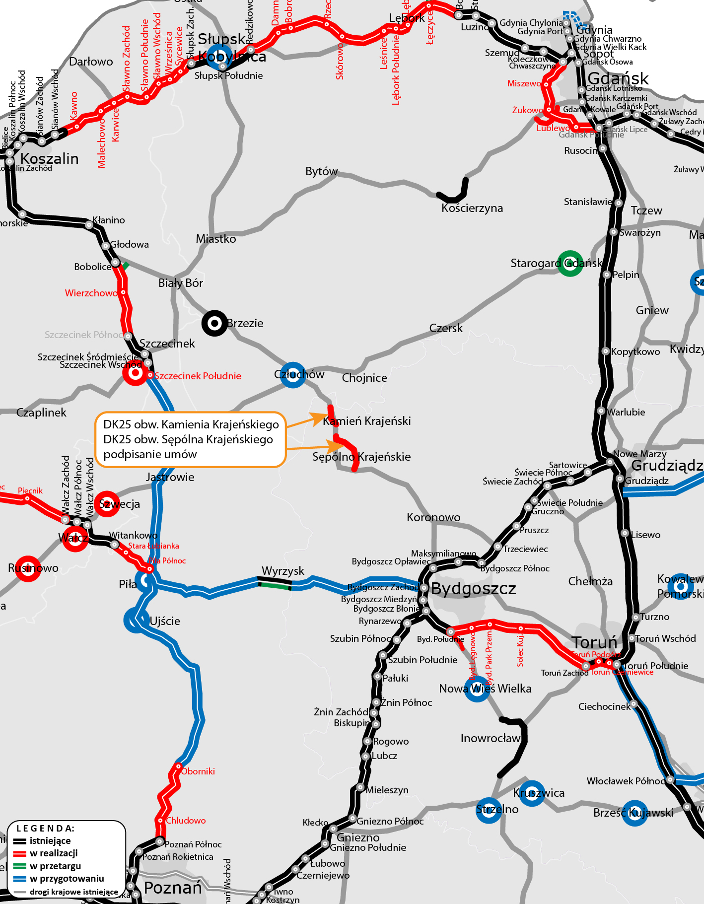 Wartość podpisanych umów to ponad 158 mln zł. Obie inwestycje uwzględnione są w Rządowym Programie Budowy Dróg Krajowych do 2030 r. i mają za zadanie wyprowadzić ruch tranzytowy z Sępólna Krajeńskiego i Kamienia Krajeńskiego. Obecnie droga krajowa nr 25 przechodzi przez ścisłe centrum obu miejscowości.