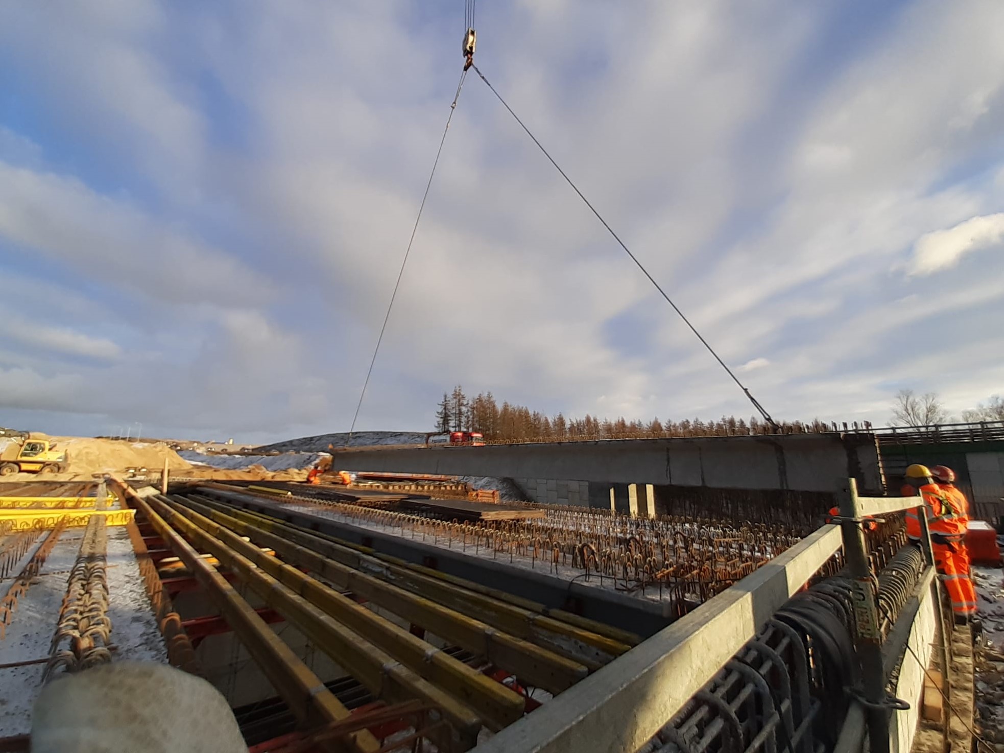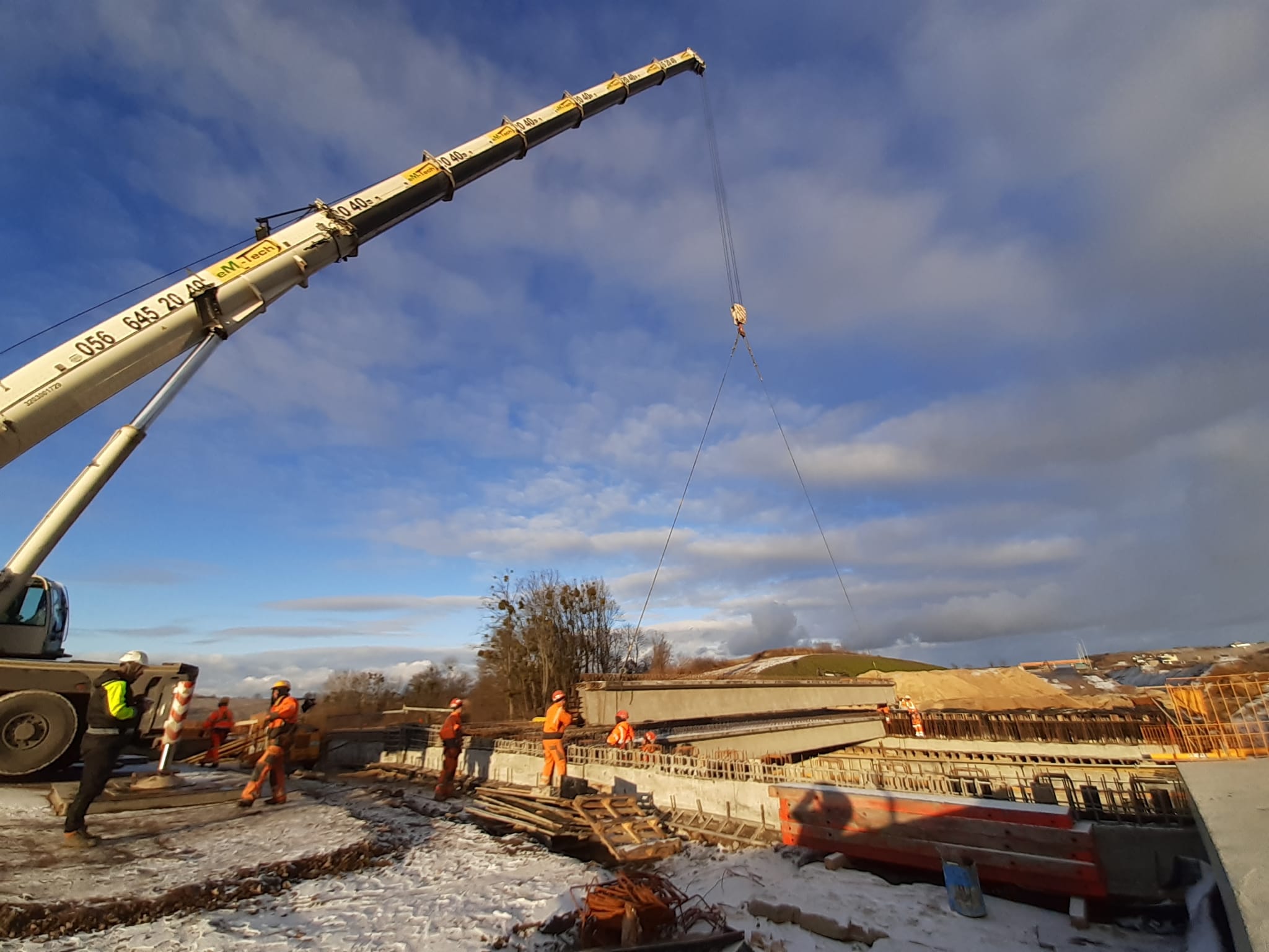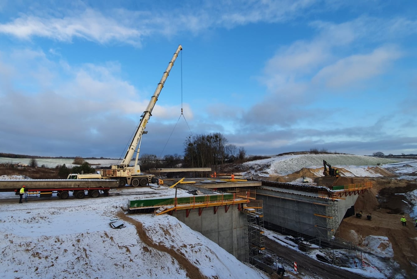 Belki zostały wyprodukowane w zakładach prefabrykacji Gralbet w miejscowości Uzdowo/k. Działdowa. Do ich montażu używany jest żuraw samochodowy Terex Demag AC 250-1, ustawiony na przygotowanej wcześniej platformie roboczej. Łącznie zamontowane zostaną 34 belki. Na koniec przewidziano kontrolę geodezyjną oraz montaż zabezpieczeń BHP, niezbędnych do dalszych prac. W zależności od sprzyjającej pogody w okresie poświątecznym, Wykonawca przystąpi do deskowania i zbrojenia ustroju nośnego.