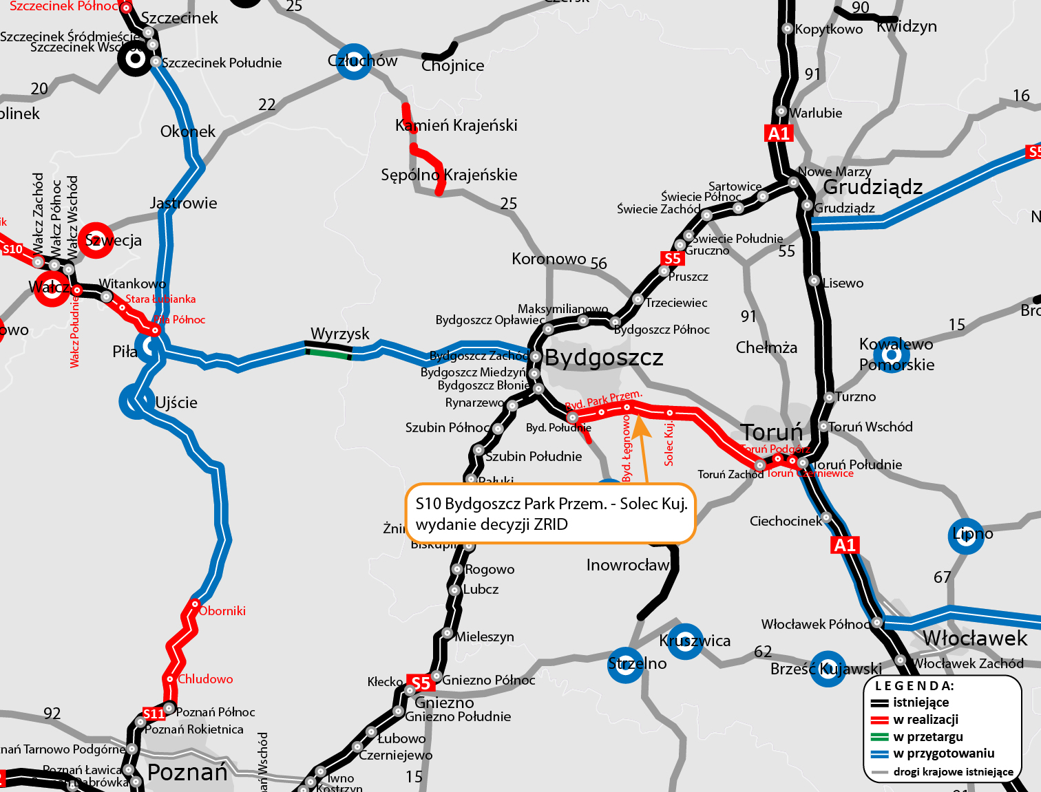 Wojewoda Kujawsko-Pomorski wydał decyzję o zezwoleniu na realizację inwestycji drogowej (ZRID) dla budowy drogi ekspresowej S10 na odcinku od węzła Bydgoszcz Park Przemysłowy do węzła Solec Kujawski. Oznacza to, że kolejne blisko 9 km drogi ekspresowej wchodzi w fazę budowy.