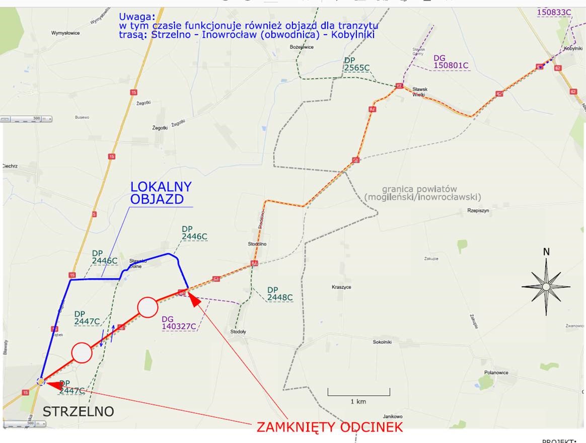 Jednocześnie funkcjonuje także objazd dla tranzytu trasą: Strzelno-Inowrocław (obwodnica)-Kobylniki.