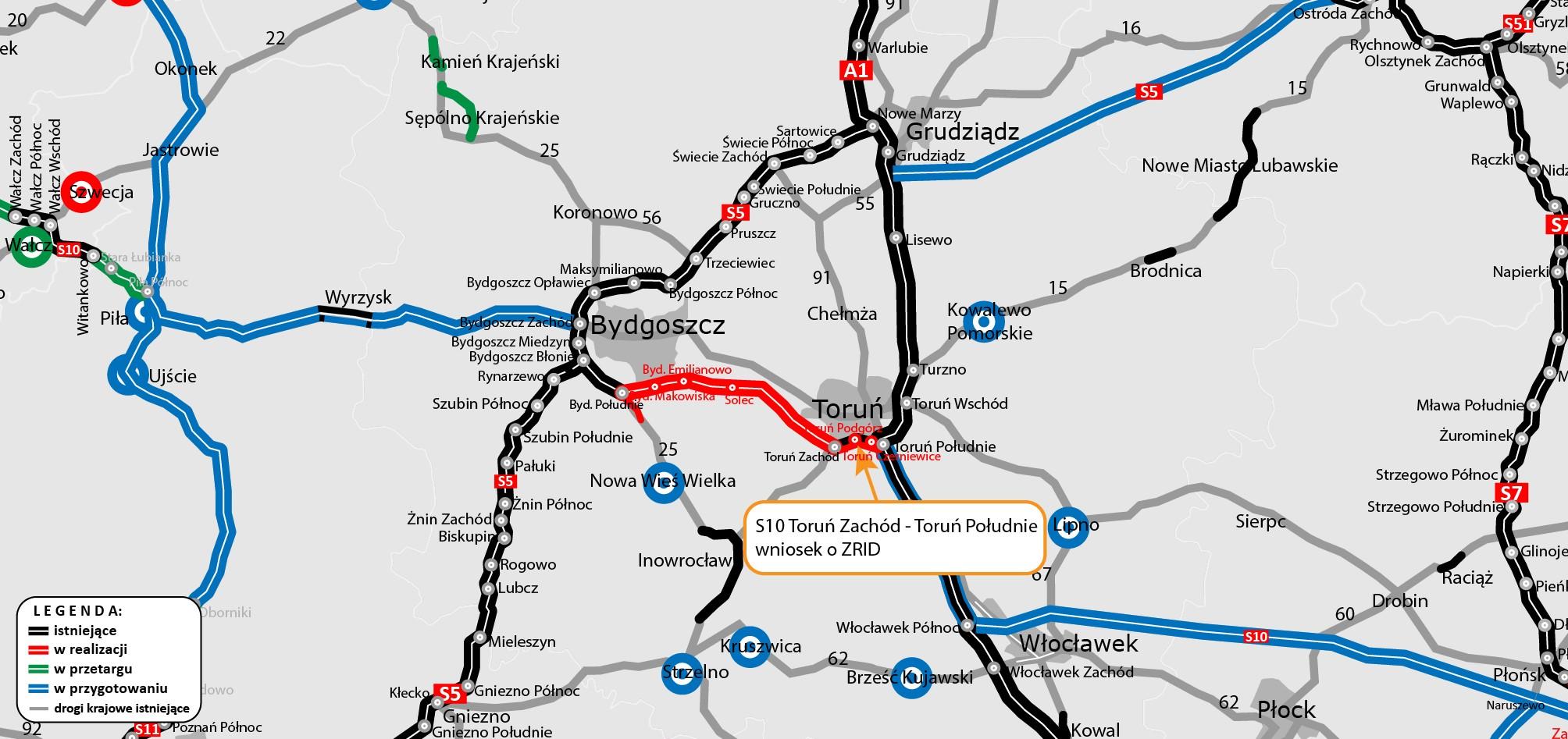 Do Wojewody Kujawsko-Pomorskiego trafił wniosek o wydanie decyzji o zezwoleniu na realizację inwestycji drogowej (ZRID) dla 12-kilometrowej drogi ekspresowej S10 na odcinku Toruń Zachód - Toruń Południe. Uzyskanie tej decyzji umożliwi rozpoczęcie budowy.