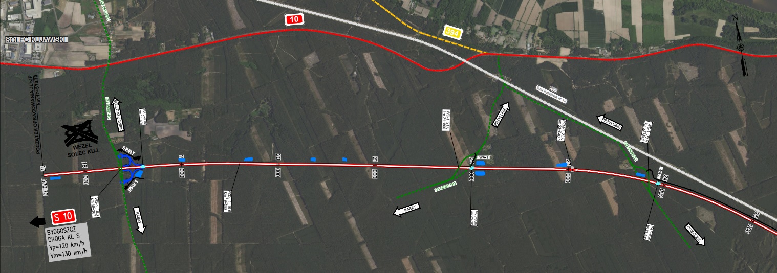 Umowę na realizację, w systemie Projektuj i buduj, dla pierwszego odcinka S10 podpisaliśmy z Grupą Mirbud w maju 2022 r., a jej wartość to 426 mln zł. Zadanie obejmuje budowę 21,2 km drogi ekspresowej S10 pomiędzy Solcem Kujawskim a Toruniem. Zbudowany zostanie m.in. nowy węzeł Solec Kujawski, a także para Miejsc Obsługi Podróżnych w Cierpicach. W ramach inwestycji powstaną też drogi równoległe do obsługi ruchu lokalnego, urządzenia ochrony środowiska (m.in. przejście dla zwierząt dużych obejmujące zarówno nową drogę, jak i sąsiadującą linię kolejową) oraz bezpieczeństwa ruchu drogowego. W sumie w ramach inwestycji powstanie 16 obiektów inżynierskich. Budowa potrwa do połowy 2027 r.