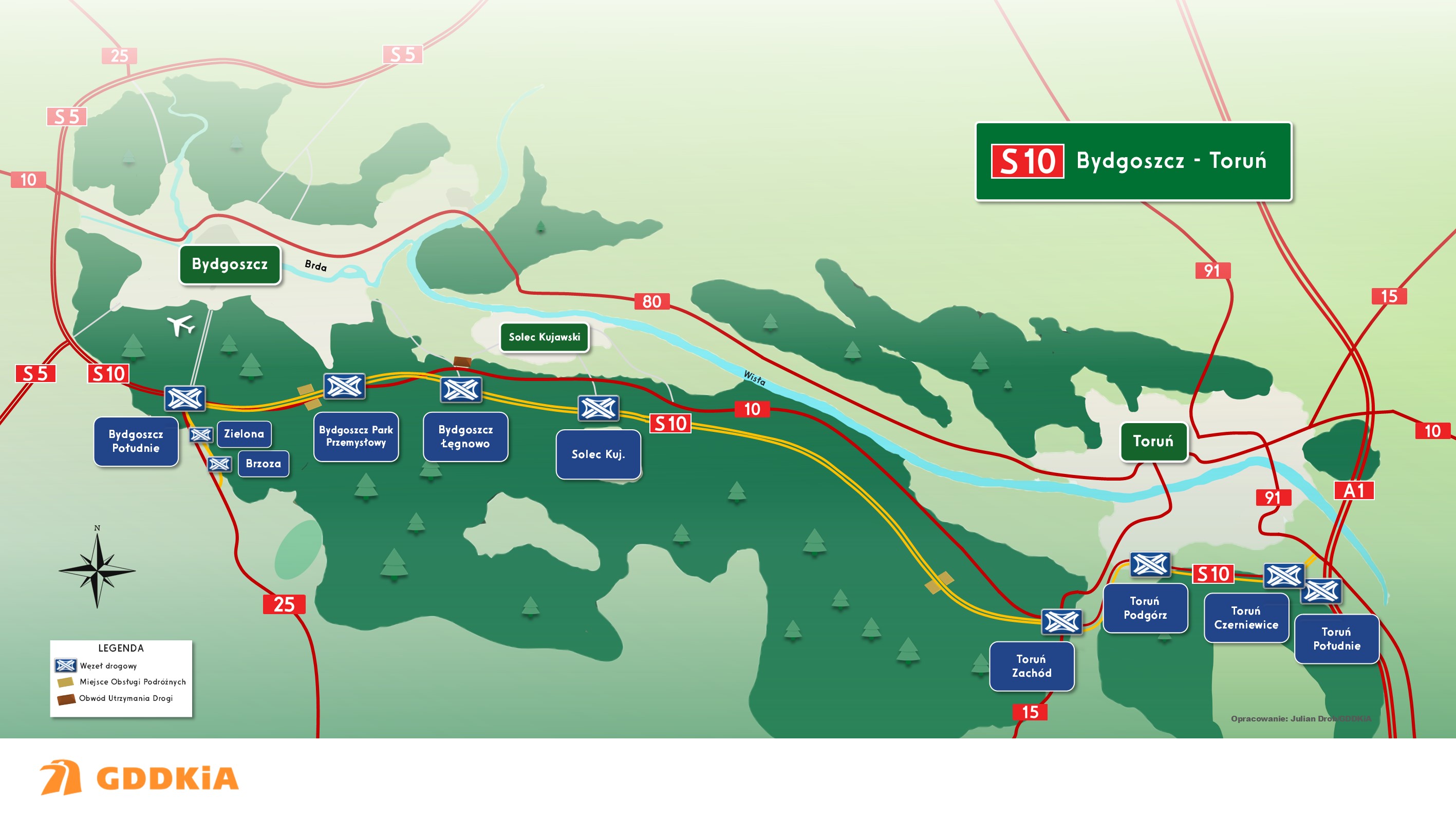 Umowę na realizację, w systemie Projektuj i buduj, dla pierwszego odcinka podpisaliśmy w maju 2022 r. Droga pobiegnie w znacznym stopniu obecnym śladem DK10, a kierowcy będą mieli do dyspozycji parę Miejsc Obsługi Podróżnych (MOP) w pobliżu węzła Bydgoszcz Park Przemysłowy (wcześniej Emilianowo). DK25 w okolicy Brzozy poprowadzona zostanie nowym śladem, dzięki czemu przeniesiemy ruch tranzytowy z mocno obciążonego odcinka na nową jezdnię z dwoma węzłami – Zielona i Brzoza. Obecnie trwa uzyskiwanie decyzji ZRID. We wrześniu br. Regionalny Dyrektor Ochrony Środowiska (RDOŚ) w Bydgoszczy wydał postanowienie w sprawie ponownej oceny oddziaływania na środowisko. Projektant doprowadził projekt do zgodności z postanowieniem, a Wojewoda Kujawsko-Pomorski wydał obwieszczenie o zakończeniu postępowania dowodowego, co oznacza ustalenie treści końcowej decyzji ZRID. Wykonawca kontynuuje prace związane z opracowaniem projektu wykonawczego oraz specyfikacji technicznych. Przeprowadzono badania archeologiczne.