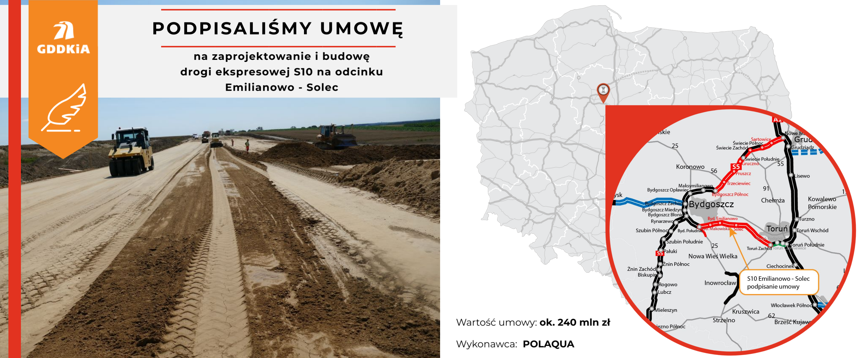 Podpisaliśmy umowę na projekt i budowę drogi ekspresowej S10 Emilianowo - Solec. To trzecia umowa na realizację, podzielonej na cztery odcinki realizacyjne, S10 Bydgoszcz - Toruń. Firma POLAQUA z Piaseczna zaprojektuje i zbuduje odcinek o długości 8,6 km. Wartość umowy to niemal 240 mln zł.