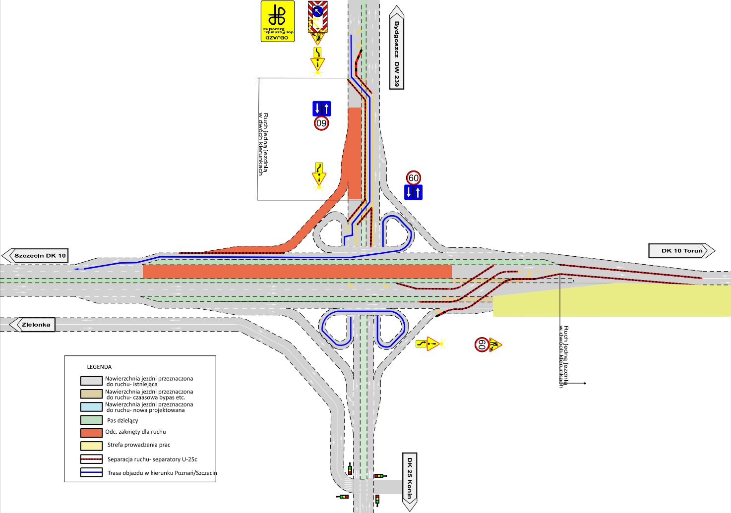 Generalna Dyrekcja Dróg Krajowych i Autostrad Oddział w Bydgoszczy informuje, że dnia 4.06.2025 roku planowana jest zmiana w organizacji ruchu drogowego na węźle drogowym Bydgoszcz Południe (tzw. „Stryszek"), który łączy drogę ekspresową S10, drogi krajowe nr 10, 25 oraz drogę wojewódzką nr 239.
