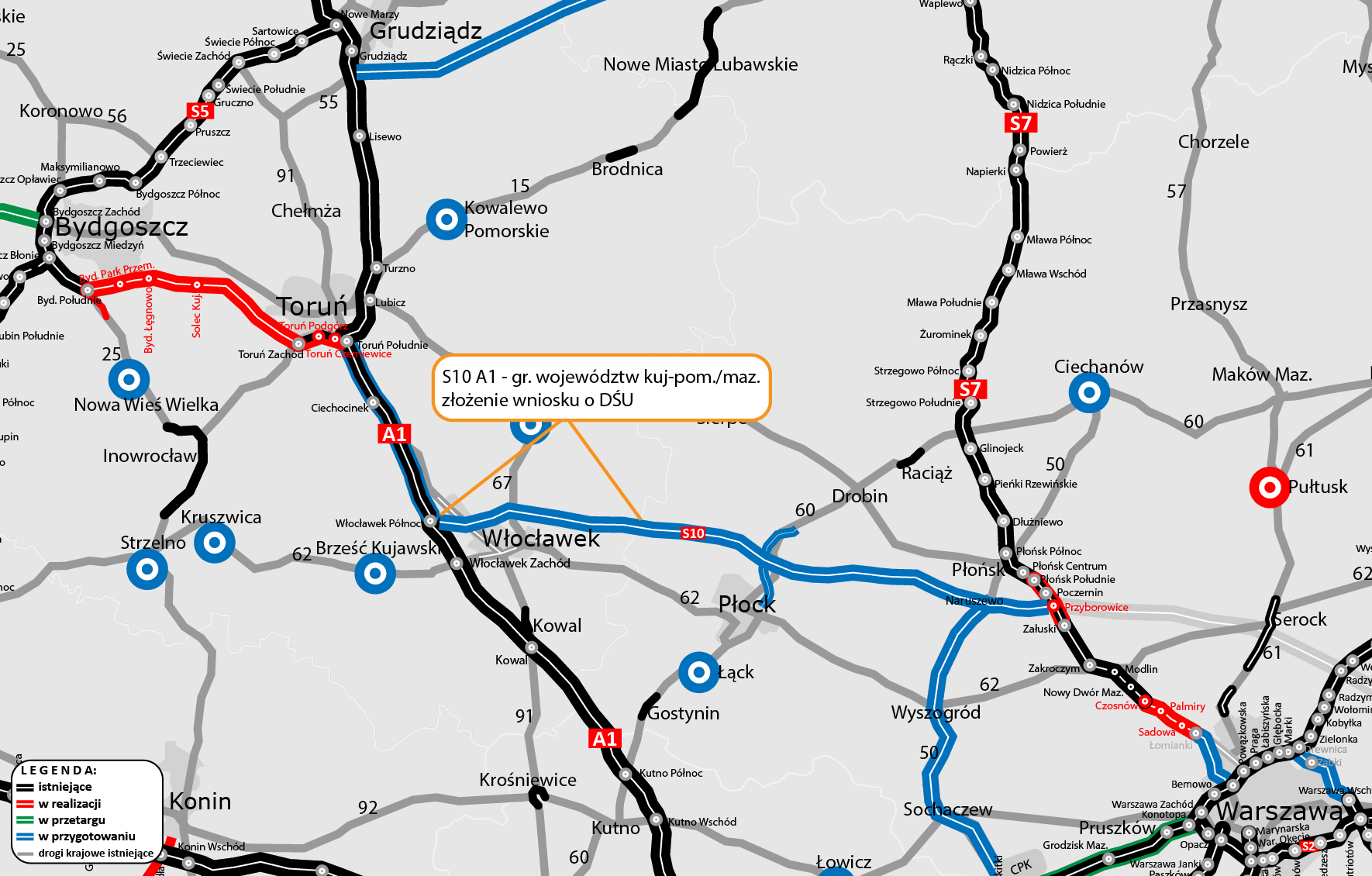 Do Regionalnej Dyrekcji Ochrony Środowiska (RDOŚ) w Bydgoszczy, zgodnie z harmonogramem, złożyliśmy wniosek o decyzję środowiskową dla odcinka drogi ekspresowej S10 od autostrady A1 do granicy woj. kujawsko-pomorskiego i mazowieckiego. Jej wydanie jest kluczowe dla powstania tej trasy.