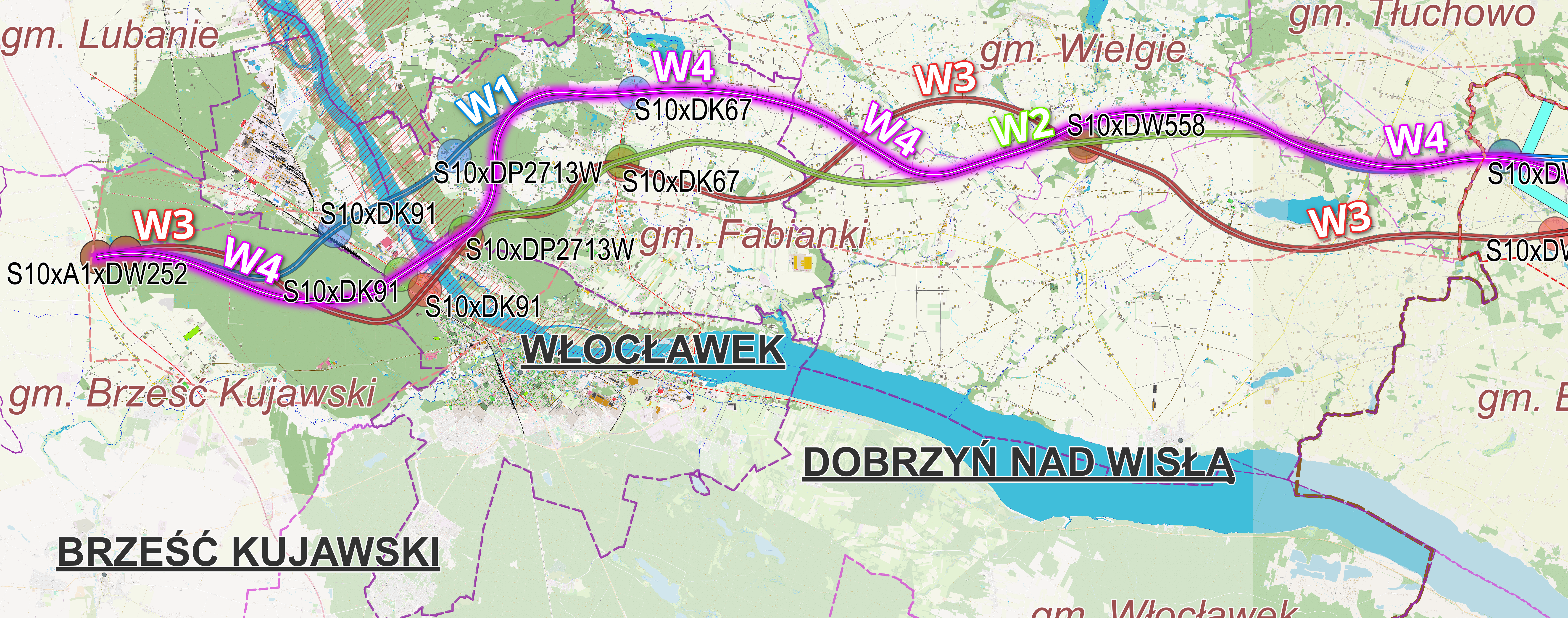 Rekomendowany wariant przebiegu S10 w woj. kujawsko-pomorskim - W4 (fioletowy) - ma długość 42,3 km. Rozpoczyna się od autostrady A1 (węzeł Włocławek Północ) i biegnie na wschód do Włocławka, gdzie przekracza Wisłę nowym mostem. Następnie trasa okrąża gminę Fabianki od północy i prowadzi dalej na wschód przez gminy Wielgie i Tłuchowo do granicy z województwem mazowieckim.