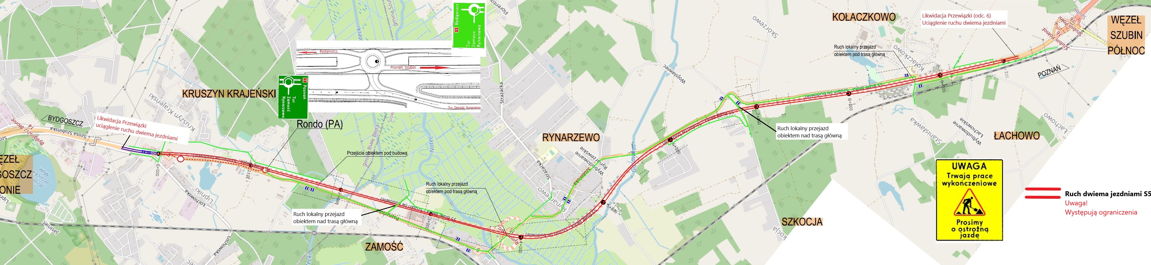 Od strony węzła Bydgoszcz Błonie w Białych Błotach kierowcy pojadą obiema jezdniami. Tymczasowe rondo od strony Białych Błot pozostanie, umożliwiając kierowcom lokalnym zjazd na starą DK5 w stronę Rynarzewa. Z kolei od strony węzła Szubin Północ zlikwidowana zostanie dotychczasowa przewiązka. Kierujących prosimy o zachowanie szczególnej ostrożności i stosowanie się do oznakowania. Na odcinku obowiązywać będzie ograniczenie do 80 km/h.