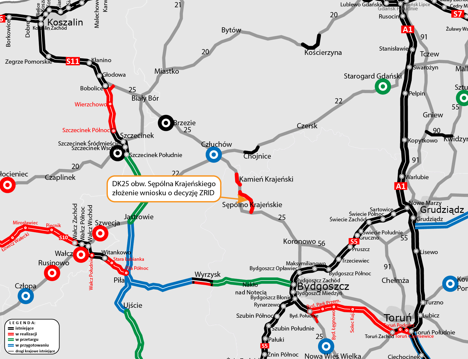 Do Wojewody Kujawsko-Pomorskiego złożyliśmy wniosek o wydanie decyzji o zezwoleniu na realizację inwestycji drogowej (ZRID) dla obwodnicy Sępólna Krajeńskiego w ciągu DK25. Przy pomyślnym przebiegu procedur administracyjnych, decyzję powinniśmy otrzymać w IV kwartale br.