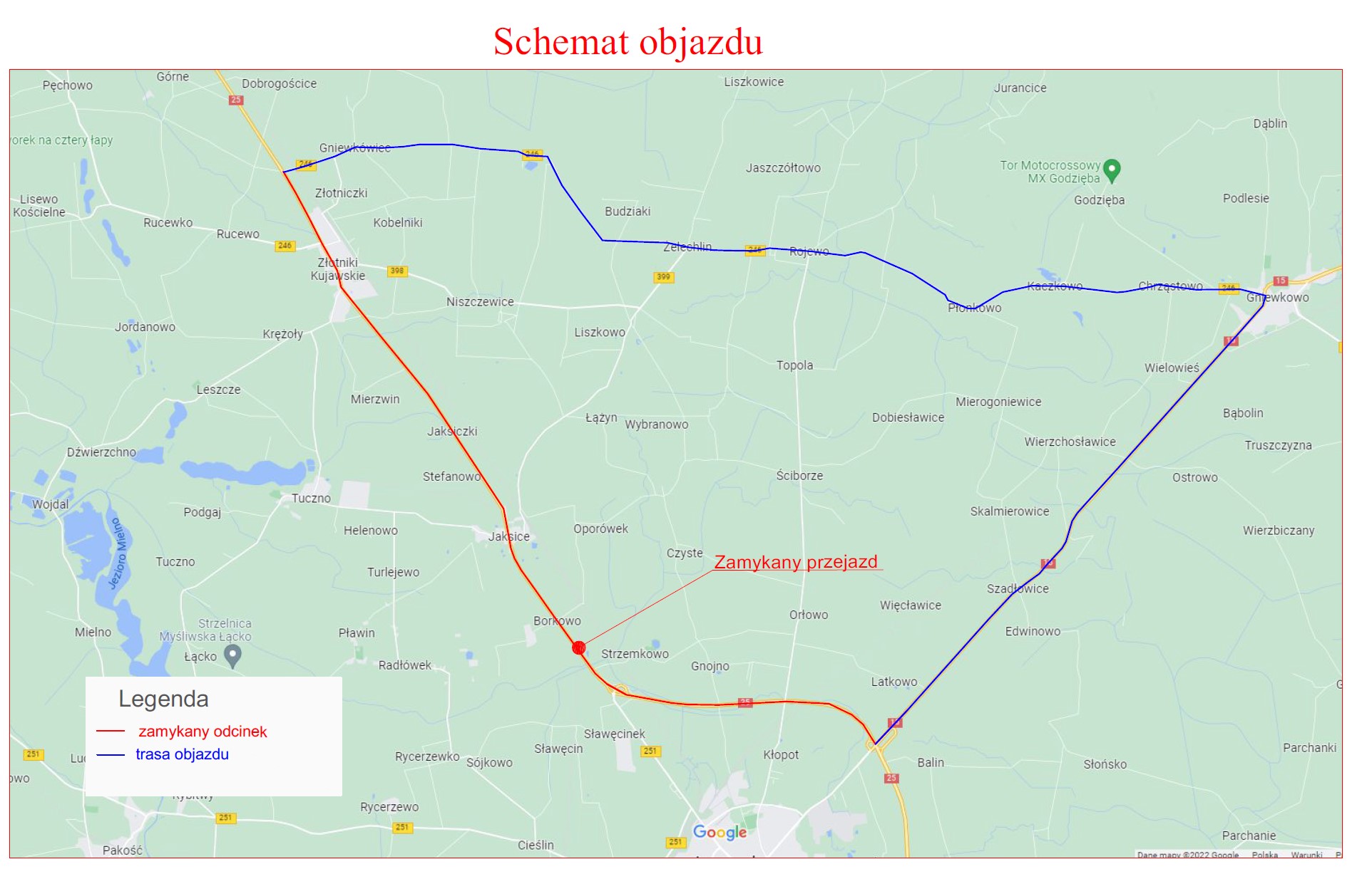 Pomorskie Przedsiębiorstwo Mechaniczno-Torowe poinformowało o konieczności wprowadzenia zmienionej organizacji ruchu w związku z robotami w obrębie przejazdu kolejowego w m. Borkowo na DK25. Przebudowa wymaga całkowitego zamknięcia przejazdu, dlatego ruch zostanie poprowadzony objazdem – z obwodnicy Inowrocławia należy kierować się DK15 przez Szadłowice do Gniewkowa, a następnie drogą wojewódzką 246 przez Kaczkowo, Płonkowo, Rojewo, Żelechlin i Gniewkówiec do DK25.