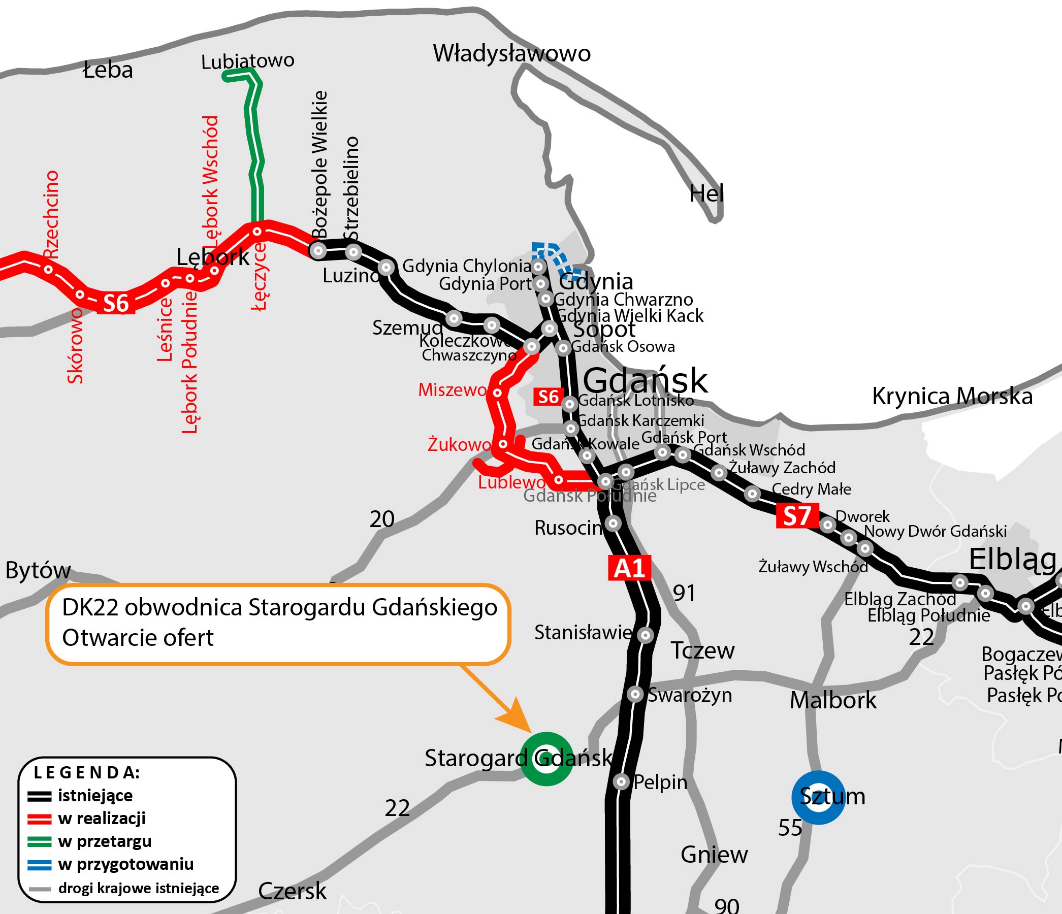 Poznaliśmy oferty w przetargu na zaprojektowanie i budowę blisko 16 km obwodnicy Starogardu Gdańskiego w ciągu drogi krajowej nr 22. Przetarg na wyłonienie wykonawcy ogłosiliśmy w połowie listopada 2024 r.