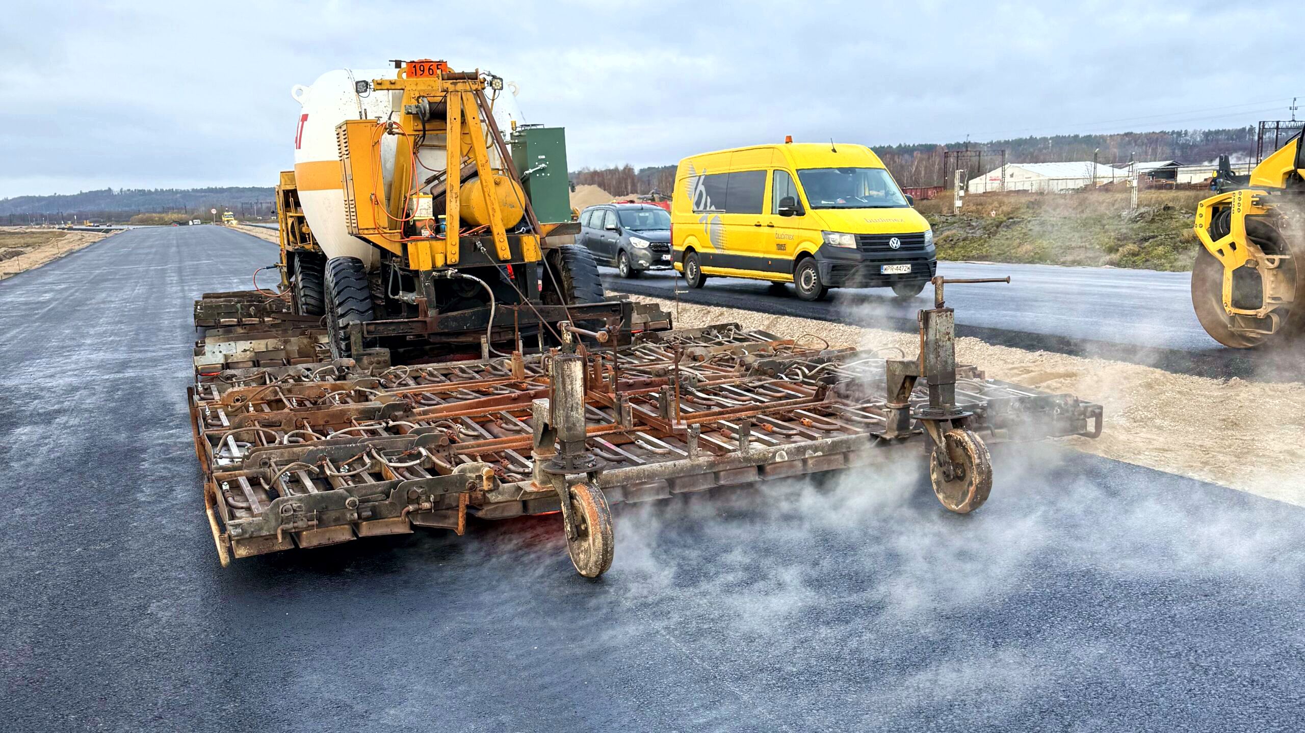 Między Leśnicami i Bożepolem Wielkim nagrzewnica pomaga, nawet przy mniej korzystnych warunkach atmosferycznych, w przygotowaniu podłoża (warstwy podbudowy z AC22P) do ułożenia kolejnej warstwy nawierzchni.