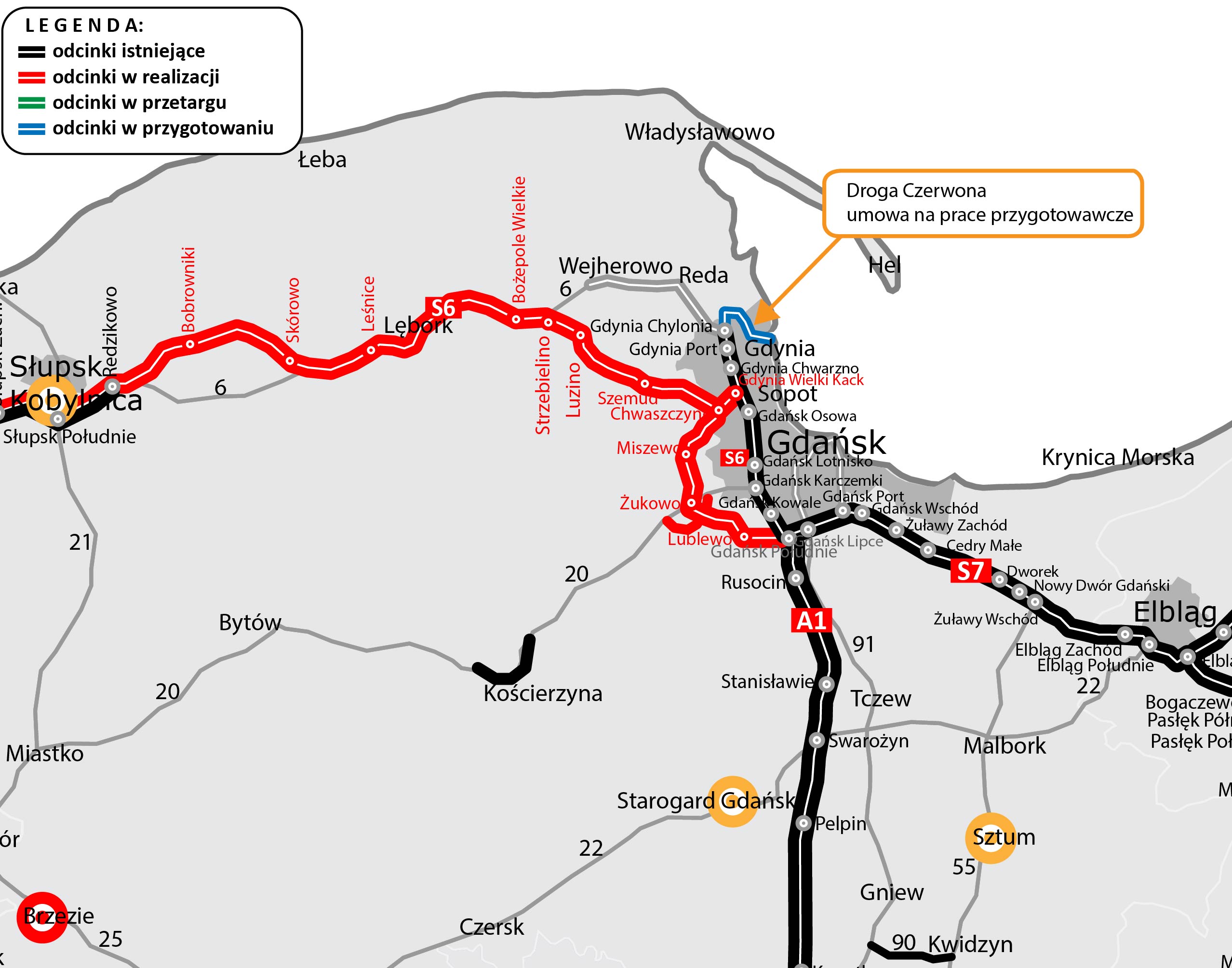 Droga Czerwona zapewni bezpośrednie połączenie Portu Gdynia z siecią dróg krajowych, w tym z trasą ekspresową S6. Nowy dwujezdniowy odcinek poprowadzi od Portu Gdynia do węzła Gdynia Chylonia w miejscu skrzyżowania ul. Morskiej z Obwodnicą Trójmiasta. Istniejąca Trasa Kwiatkowskiego ma ograniczenia nośności i nie zapewnia dobrego połączenia dla ruchu ciężkiego z portem. Droga Czerwona takich ograniczeń nie będzie miała, poprawi dostępność do portu od strony lądu i zwiększy jego możliwości przeładunkowe i rozwojowe.