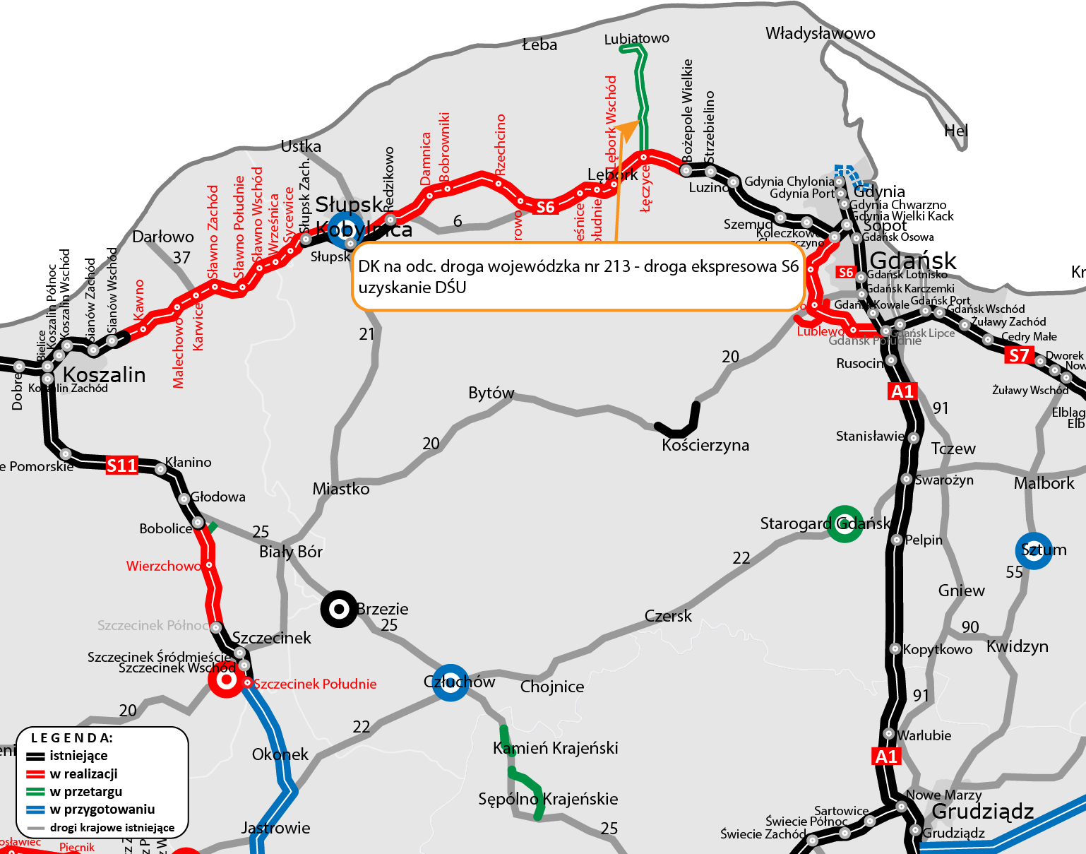 Oferty w przetargu na realizację odcinka Lubiatowo - DW213 poznaliśmy 20 stycznia 2025 r., a dla odcinka DW213 – droga ekspresowa S6 (węzeł Łęczyce) poznamy je 18 lutego 2025 r. Podpisanie umów z wykonawcami inwestycji planujemy w II kw. 2025 r.
