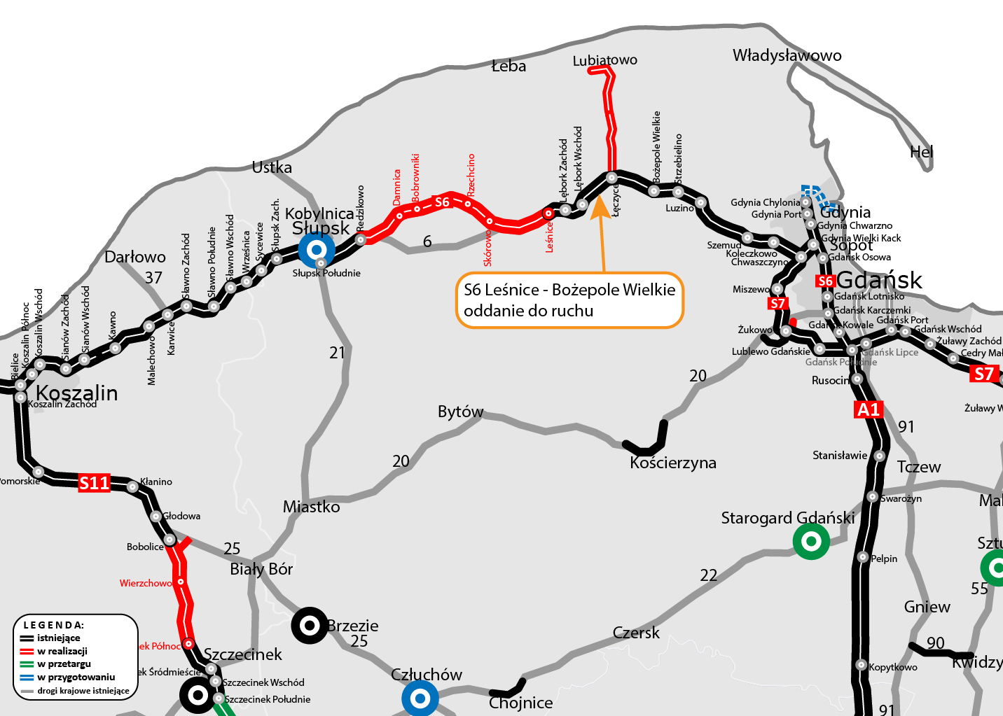 Pod koniec 2022 r. oddaliśmy do użytkowania trzy fragmenty S6 między Bożepolem Wielkim a Gdynią, o łącznej długości 42 km. Inwestycja była podzielona na trzy odcinki realizacyjne: Bożepole Wielkie – Luzino, Luzino – Szemud i Szemud – Gdynia. Na początku lipca 2025 r. oddaliśmy do ruchu drugą jezdnię obwodnicy Słupska w ciągu S6 o długości 9,5 km (pierwsza jezdnia powstała w latach 2008-2010).