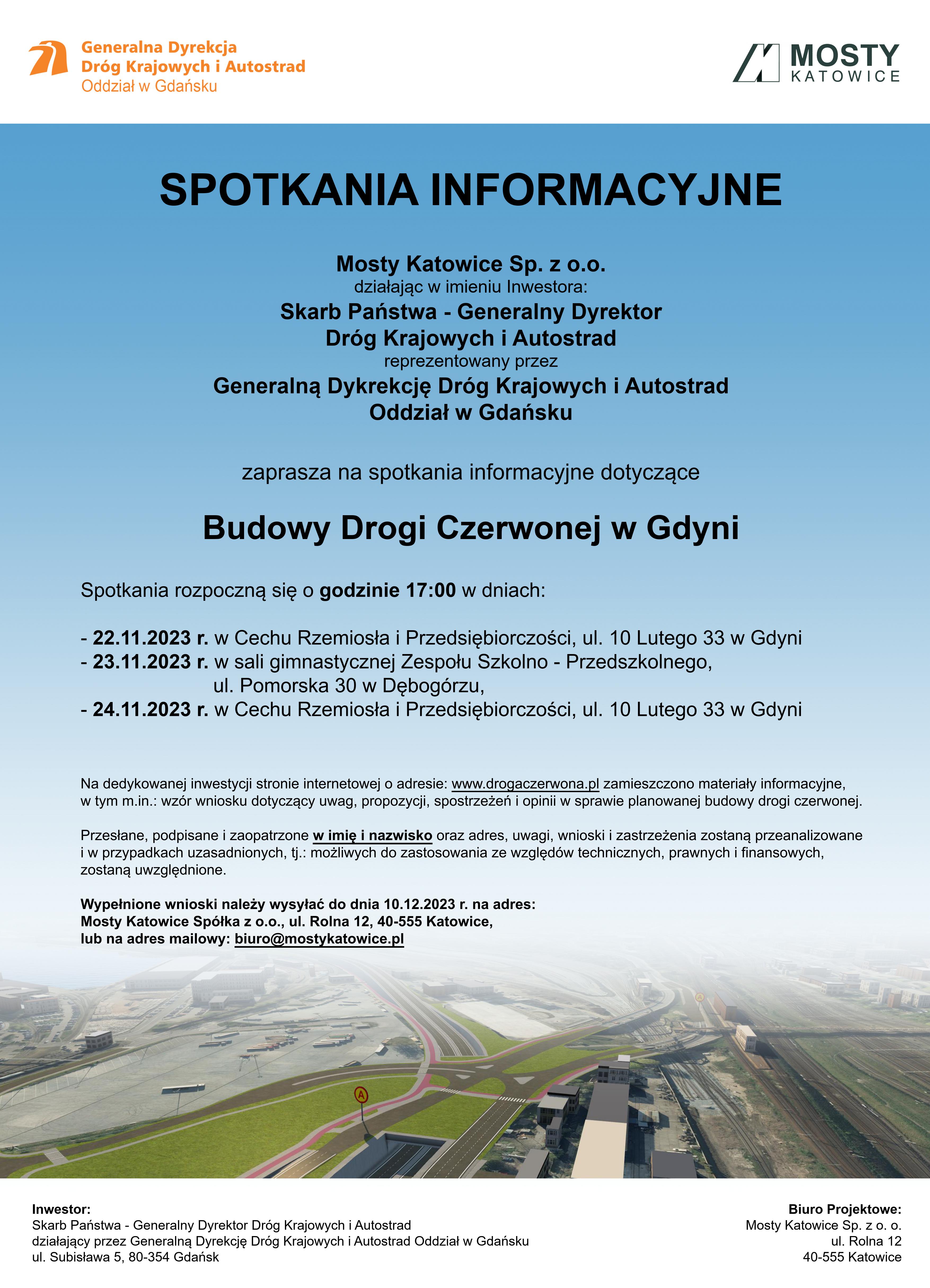 Zapraszamy na spotkania informacyjne w sprawie przebiegu Drogi Czerwonej w Gdyni. Nowa trasa ma połączyć w przyszłości istniejącą sieć dróg szybkiego ruchu z rozwijającym się portem w Gdyni.