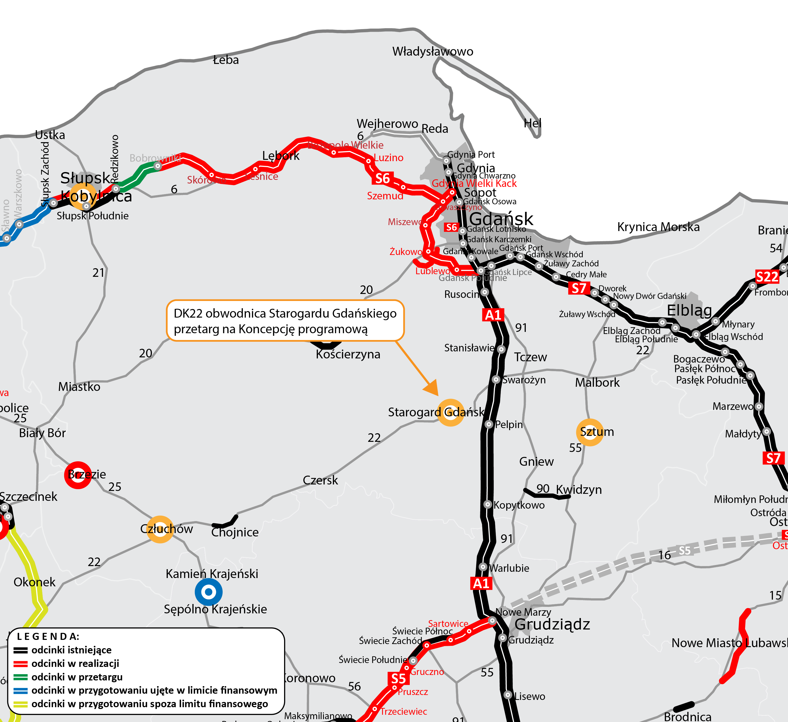 Przybliża się realizacja obwodnicy Starogardu Gdańskiego w ciągu drogi krajowej nr 22. Uruchomiliśmy przetarg na przygotowanie kolejnego etapu dokumentacji – koncepcji programowej, która dokładnie pokaże, jak będzie wyglądała przyszła droga. Gotowa dokumentacja będzie podstawą do ogłoszenia przetargu na projekt i budowę. Przypominamy, że wcześniej jeszcze w grudniu 2020 r. Komisja Oceny Przedsięwzięć Inwestycyjnych zatwierdziła wariant V obwodnicy, omijający miasto od południa. W kolejnym kroku w marcu br. złożyliśmy do Urzędu Gminy w Starogardzie Gdańskim wniosek o wydanie decyzji o środowiskowych uwarunkowaniach inwestycji.