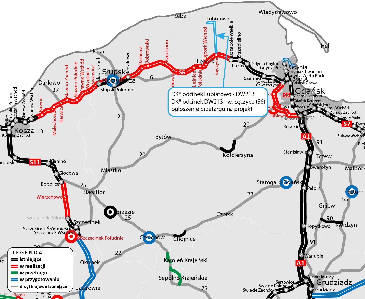 Rozpoczęty przetarg, którego szczegóły za kilka dni pojawią się na naszej platformie zakupowej, dotyczy zaprojektowania i wybudowania jednojezdniowej drogi, o przekroju 1x2 w klasie GP (główna ruchu przyspieszonego). Inwestycję podzieliliśmy na dwa odcinki, Lubiatowo – droga wojewódzka nr 213 (o długości ok. 11 km) oraz droga wojewódzka nr 213 – węzeł Łęczyce na S6 (ok. 15 km). Dodatkowo w ramach obecnie realizowanej trasy S6 na odcinku Leśnice – Bożepole Wielkie wykonany zostanie łącznik między drogą powiatową w Łęczycach a drogą ekspresową S6, który skomunikuje nową drogę krajową z węzłem Łęczyce.