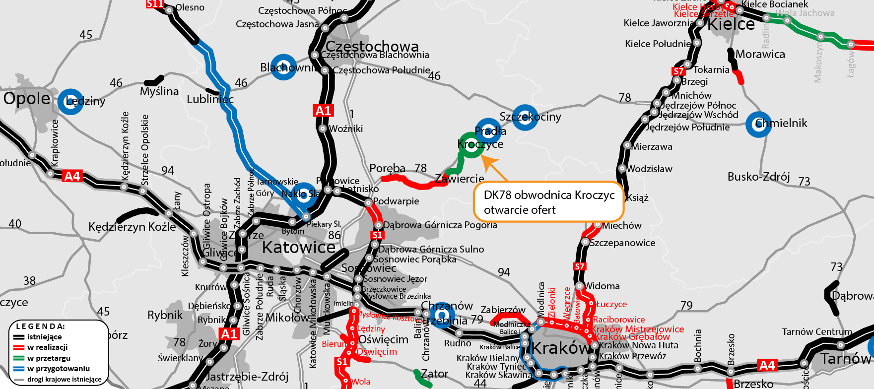 Osiem ofert mieści się w kwocie prawie 178 mln zł, jaką GDDKiA zamierzała przeznaczyć na realizację tej inwestycji. Najtańszą, w wysokości ponad 162 mln zł, złożyła Firma NDI z Sopotu. Obwodnica Kroczyc w ciągu DK78, o długości ok. 9,1 km, będzie pierwszą, jaka powstanie w woj. śląskim w ramach rządowego Programu Budowy 100 Obwodnic.