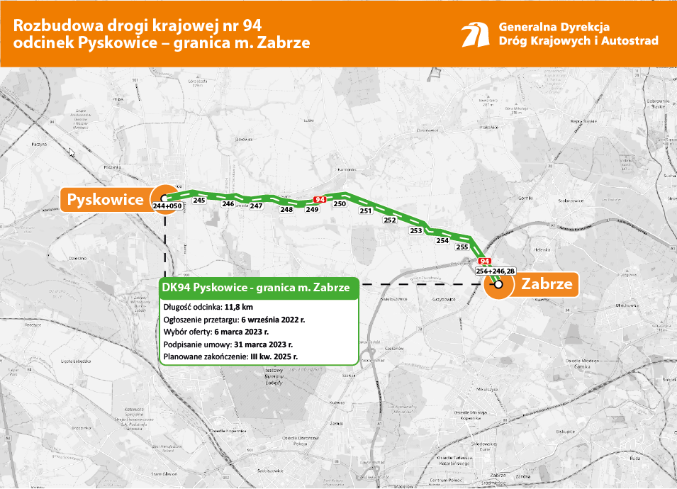 Od skrzyżowania DK94 z ul. Gliwicką w Pyskowicach do skrzyżowania z ul. Dworcową w Wieszowie ułożono już warstwę ścieralną. Na tym odcinku, a także na drogach bocznych dochodzących do DK94, w najbliższym czasie kontynuowane będą prace związane z uzupełnianiem warstwy ścieralnej. Ku końcowi zbliżamy się także z montażem urządzeń bezpieczeństwa ruchu, wykonaniem oznakowania pionowego i poziomego oraz robotami wykończeniowymi na poboczach, oraz ciągach pieszo-rowerowych.