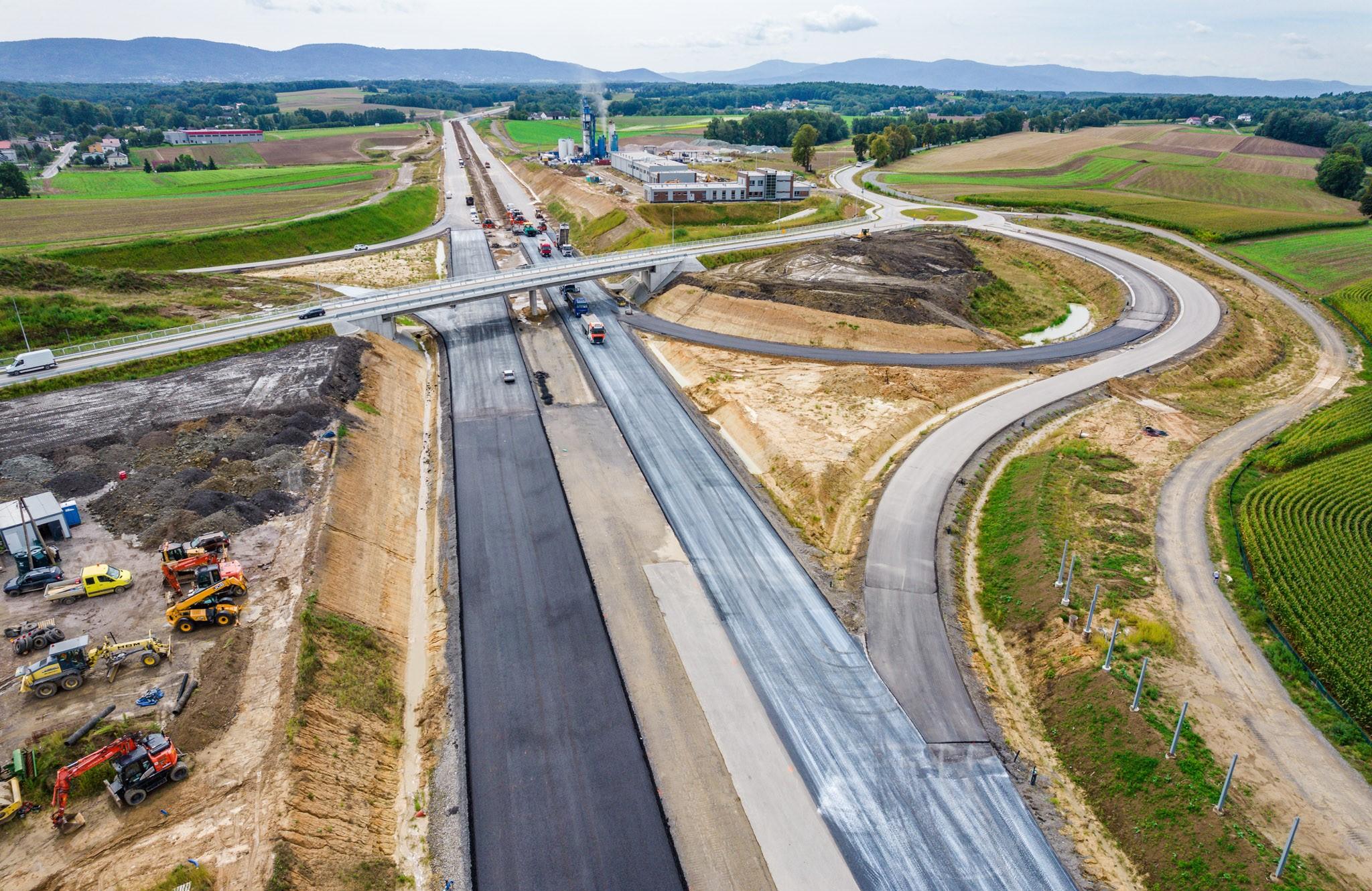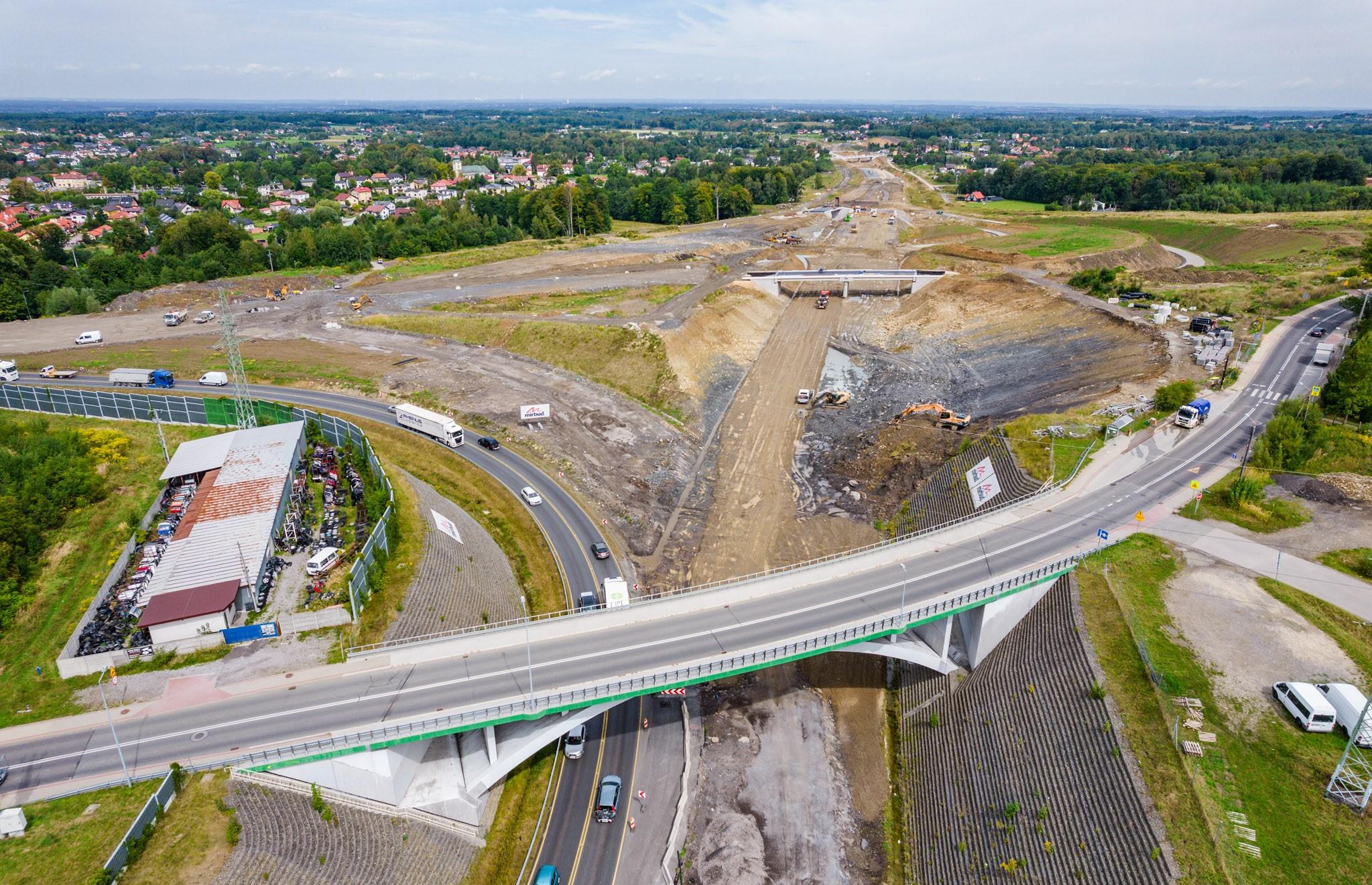Wykonywane są wykopy i nasypy, układane są kolejne warstwy nawierzchni bitumicznej m.in. na węźle Stara Wieś. Prowadzone są prace brukarskie, umacniane są rowy, układane są ścieki trójkątne, profilowane są skarpy. Przy budowie węzła Hałcnów trwa realizacja robót ziemnych oraz kanalizacji deszczowej. Zaawansowanie robót drogowych przekroczyło 50 proc.