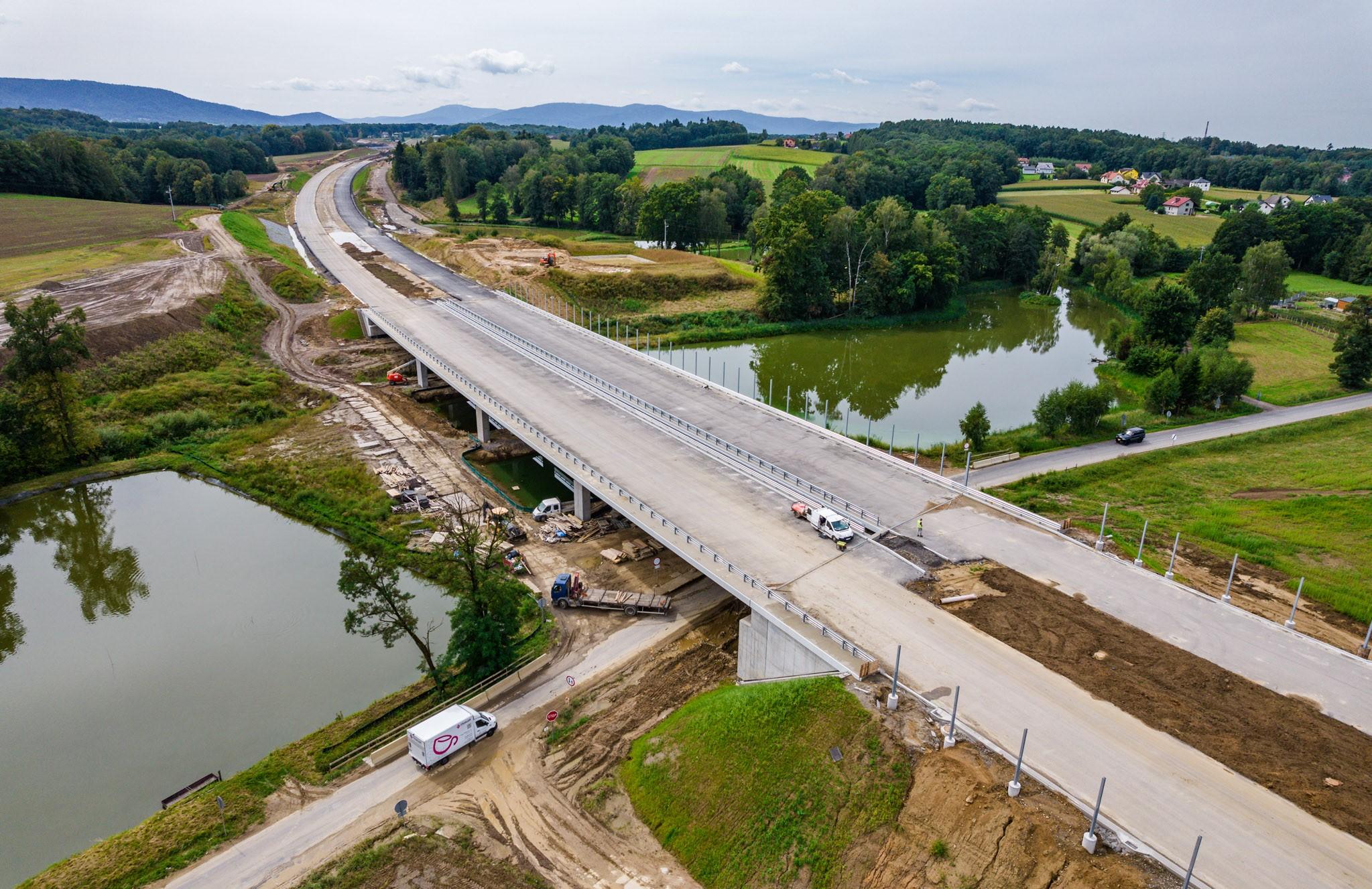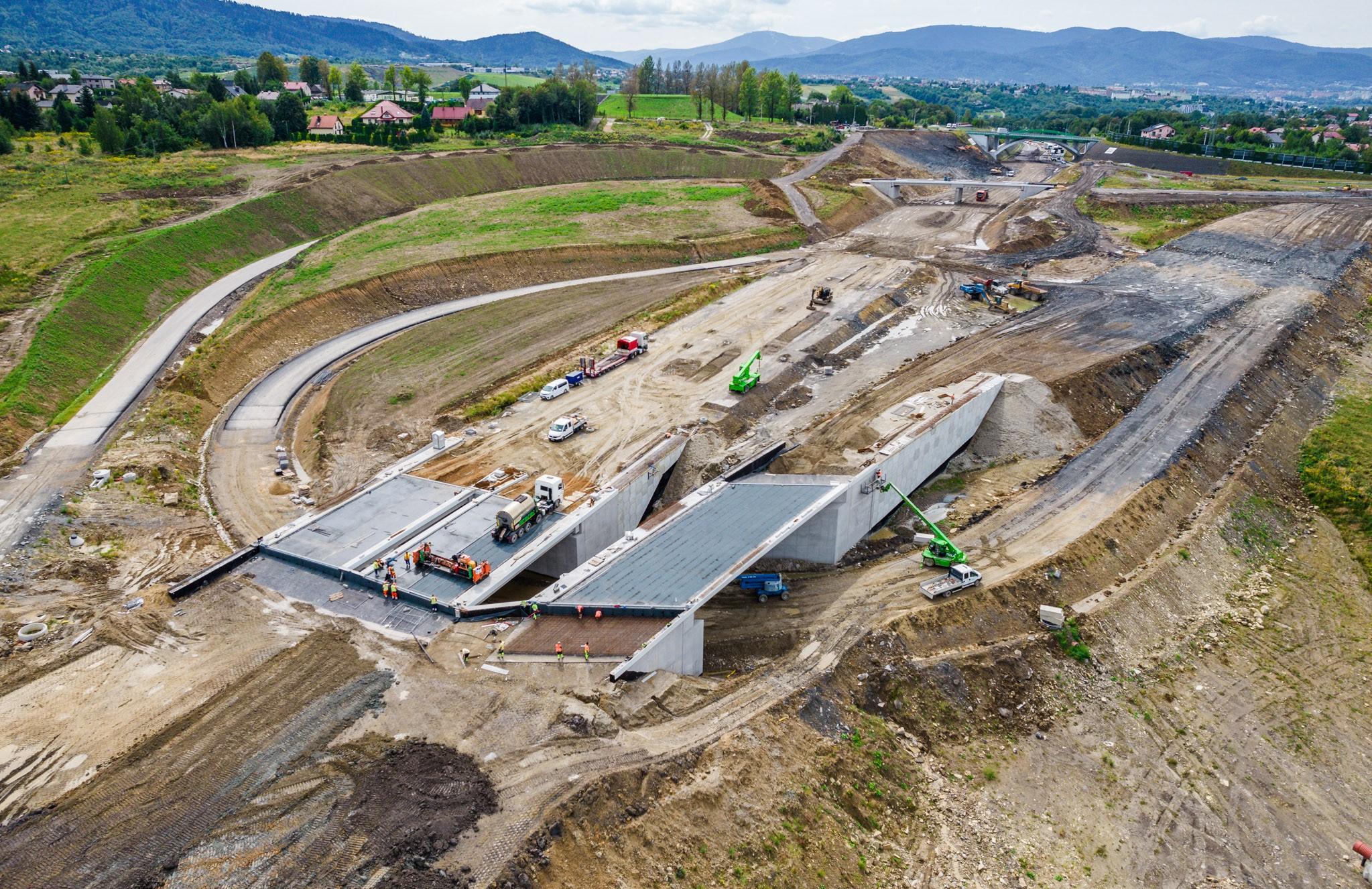 Dobiegają końca prace związane z układaniem nawierzchni asfaltowej na płytach pomostu. Wykonywane są także roboty wykończeniowe – instalowane są kotwy barier energochłonnych i barier z poręczą, wklejane są kotwy ekranów przeciwolśnieniowych i akustycznych. Montowane są bariery na obiektach mostowych. Niemal 90 proc. wynosi zaawansowanie prac mostowych. 19 sierpnia br. oddaliśmy do użytkowania wiadukt drogowy w ciągu drogi powiatowej Wilamowice - Bielsko-Biała w ciągu ul. Wyzwolenia w Hałcnowie.
