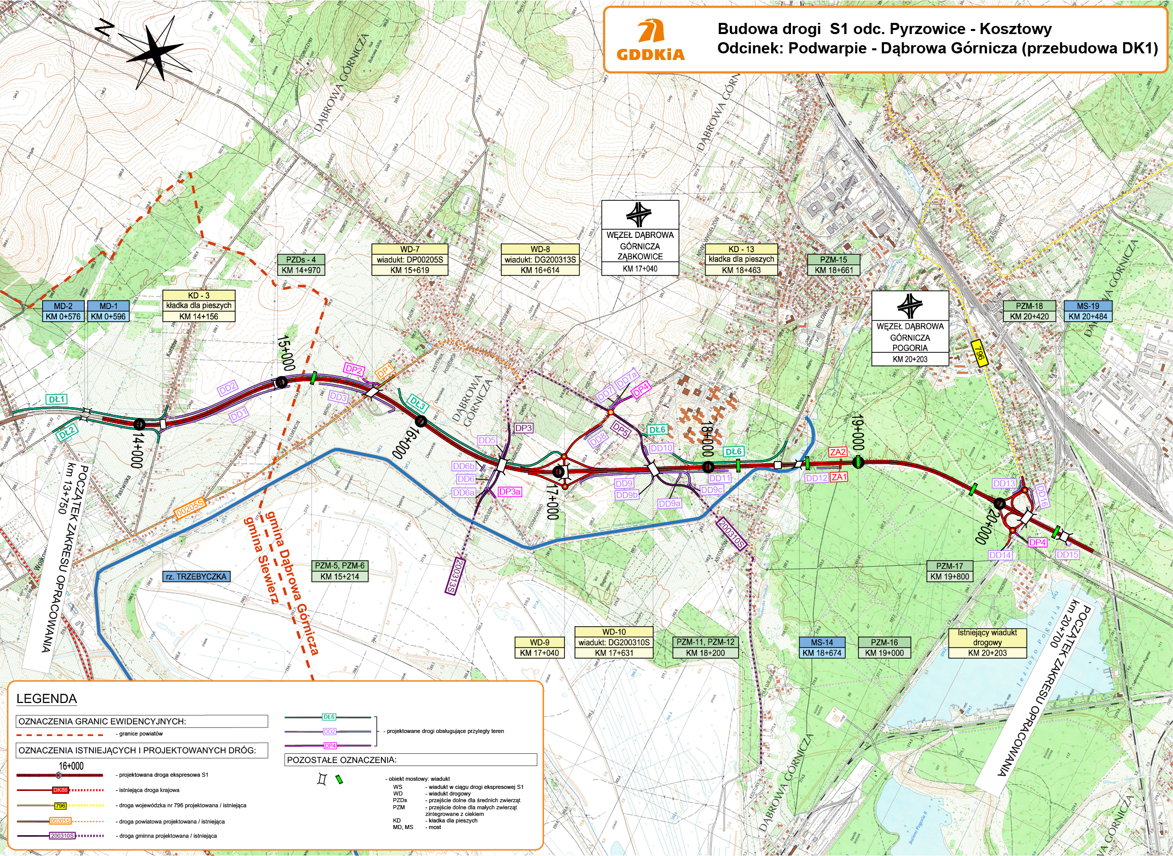 Wykonawca realizuje wszystkie obiekty objęte kontraktem. Most drogowy nad ciekiem Pogoria (MS19) oraz wiadukt drogowy w ciągu ul. Konstytucji (WD10) mają już wykonany cały zakres żelbetowy. Dodatkowo w ciągu ulic Ujejskiej, Krynicznej, Konstytucji oraz na węźle Ząbkowice realizowane są cztery wiadukty drogowe z zaawansowaniem od 30 do 80 procent. Zakończenie prac na 10 obiektach żelbetowych - przepustach i przejściach dla zwierząt - umożliwiło ruch na prawej jezdni DK1 i na drogach bocznych.