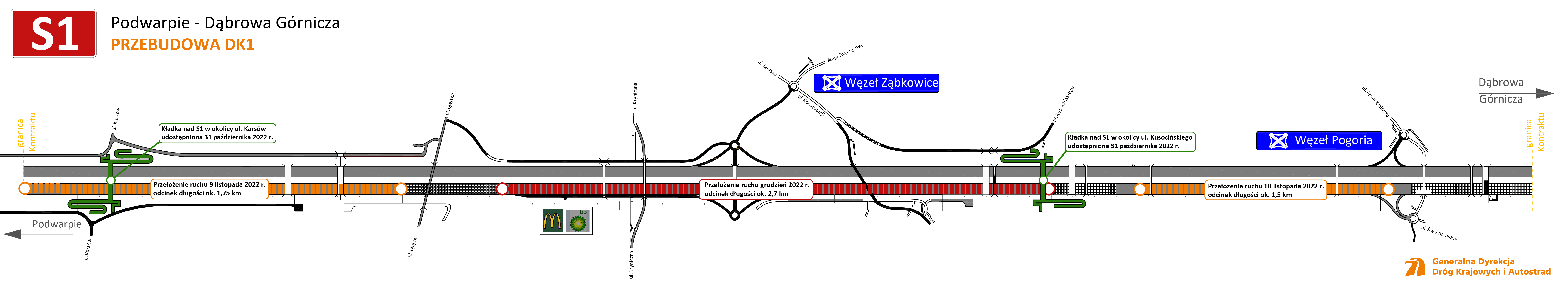 Przeniesiemy ruch z istniejącej DK1 na dwa odcinki nowo wybudowanej jezdni, o łącznej długości ponad 3 km. Dzięki tym zmianom kierowcy uzyskają komfortowy przejazd po nowej, równej i szerszej jezdni drogi ekspresowej S1. 31 października br. udostępniliśmy dwie kładki nad drogą krajową w Dąbrowie Górniczej: jedną w rejonie ulicy Karsów, a drugą w rejonie ulicy Kusocińskiego. Dzięki udostępnieniu tych kładek piesi i rowerzyści mogą komfortowo i bezpiecznie przemieszczać się nad przebudowywaną drogą.