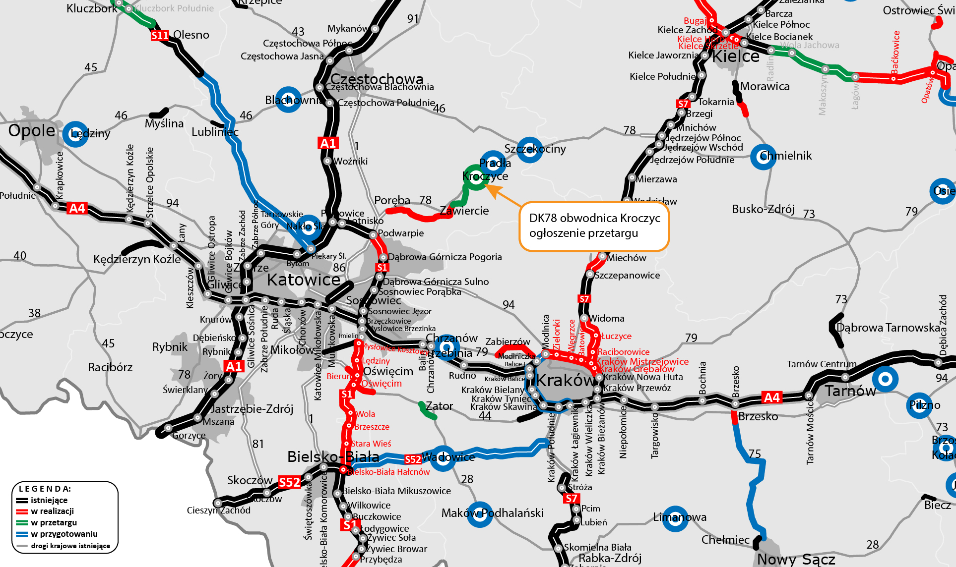 Obwodnica Nakła Śląskiego i Świerklańca w ciągu DK78 jest na etapie opracowywania Studium techniczno-ekonomiczno-środowiskowego (STEŚ) wraz z elementami koncepcji programowej. Zadanie przewidziano do realizacji w latach 2026-2029. Początek projektowanej obwodnicy uległ zmianie w stosunku do poprzednich rozwiązań. Droga zostanie włączona do projektowanego w ramach S11 węzła Tarnowskie Góry Zachód jako kolejny wariant do przeanalizowania w ramach opracowania STEŚ. Z kolei decyzja odnośnie doboru przekroju drogi zostanie podjęta po weryfikacji opracowania prognozy ruchu.
