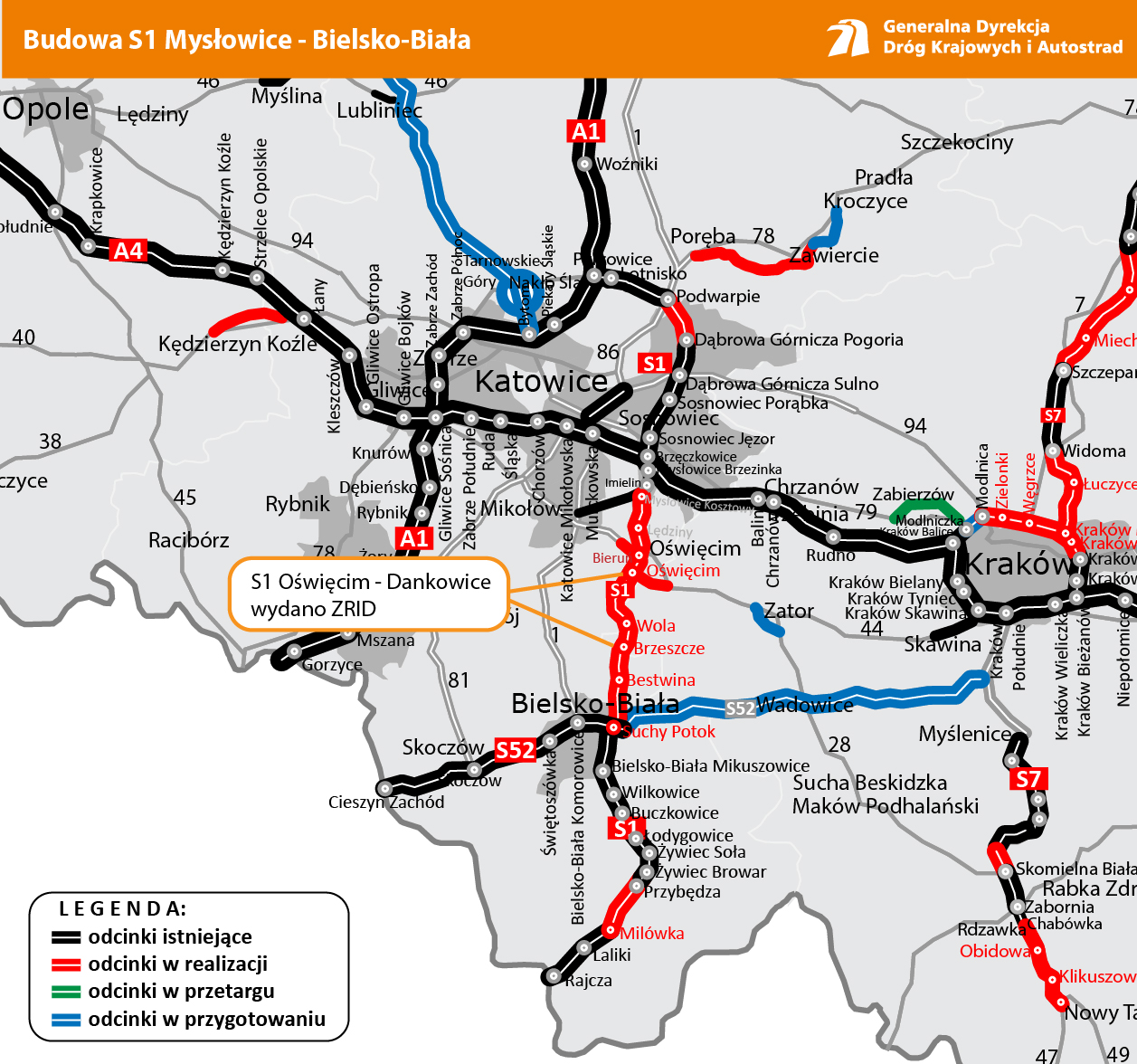 Wojewoda Śląski wydał decyzję o zezwoleniu na realizację inwestycji drogowej (ZRID) na budowę drogi ekspresowej S1 o długości około 15 km pomiędzy węzłem Oświęcim a Dankowicami. Decyzja opatrzona rygorem natychmiastowej wykonalności umożliwia w najbliższym czasie przekazanie terenu budowy wykonawcy i rozpoczęcie robót budowlanych na pierwszym z czterech odcinków S1 pomiędzy Mysłowicami a Bielskiem-Białą.
