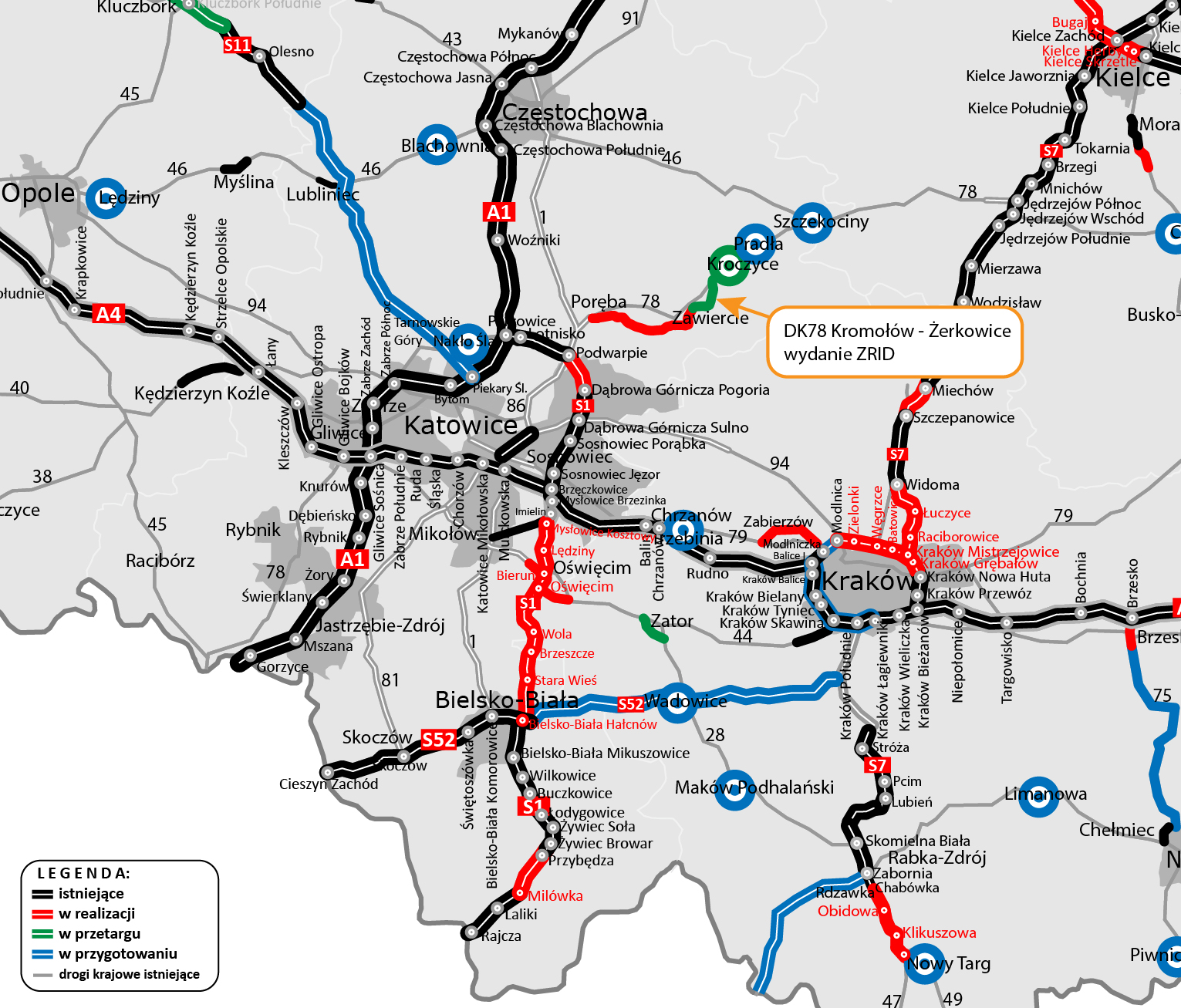 Łącznie, w ramach tych trzech zadań inwestycyjnych, wybudujemy prawie 34-kilometrowy odcinek DK78, z czego obwodnica Poręby i Zawiercia będzie mierzyła prawie 24 kilometry. Całością nowego przebiegu tej części DK78 przejedziemy w 2027 r., przy czym zakończenie pierwszego odcinka obwodnicy Poręby i Zawiercia nastąpi w 2025 roku, obwodnicy Kroczyc w 2026 r. zaś drugiego odcinka obwodnicy Poręby i Zawiercia w 2027 r.