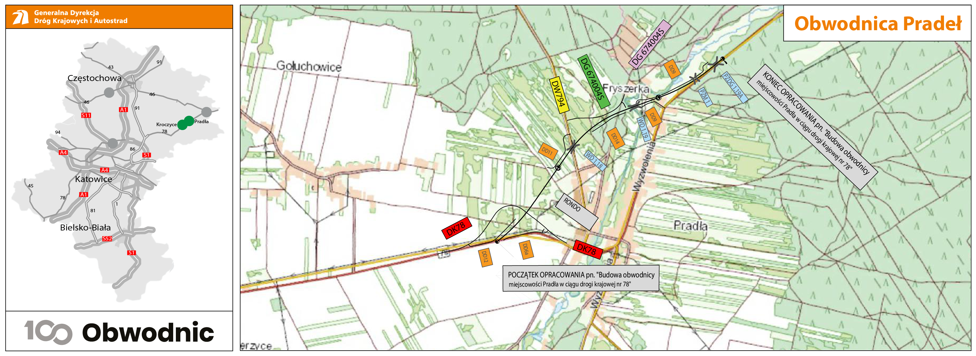 Obwodnica Pradeł będzie kolejnym elementem układanki tworzącej blisko 50 km nowego przebiegu DK78 pomiędzy Siewierzem i Szczekocinami. Stanowić będzie kontynuację obwodnicy Poręby i Zawiercia, której I etap jest w realizacji, a dla II etapu szukamy wykonawcy oraz obwodnicy Kroczyc, której będzie przedłużeniem. W procedowaniu jest też wniosek o decyzję ZRID dla obwodnicy Szczekocin i Goleniów. Projektanci pracują również nad dokumentacją dla rozbudowy odcinka Pradła – Irządze. W efekcie tych wszystkich działań do 2027 r. przebudujemy lub wybudujemy w nowym śladzie prawie 55 km DK78 we wschodniej części województwa.